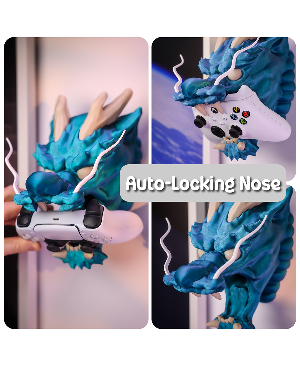 Der Dragon Controller Stand verfügt über einen innovativen Verriegelungsmechanismus, der dafür sorgt, dass Ihr Controller an seinem Platz bleibt. Legen Sie Ihren Controller einfach in die Greifbacken des Drachens und er sichert ihn automatisch mithilfe seiner Nase. Wenn Sie bereit zum Spielen sind, heben Sie die Nase an, um Ihre Controller mühelos freizugeben.