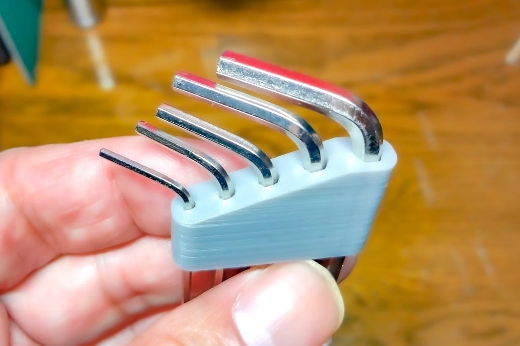 Einfacher und kompakter Innensechskantschlüsselhalter. Dieser kleine Innensechskantschlüsselhalter bietet Platz für insgesamt 5 Innensechskantschlüssel (1,5 mm / 2,0 mm / 2,5 mm / 3,0 mm / 4,0 mm), die mit einem allgemeinen 3D-Drucker geliefert werden. Es ist kompatibel mit Ender3 V2, Artillery Genius, Kingroon KP3S usw.
