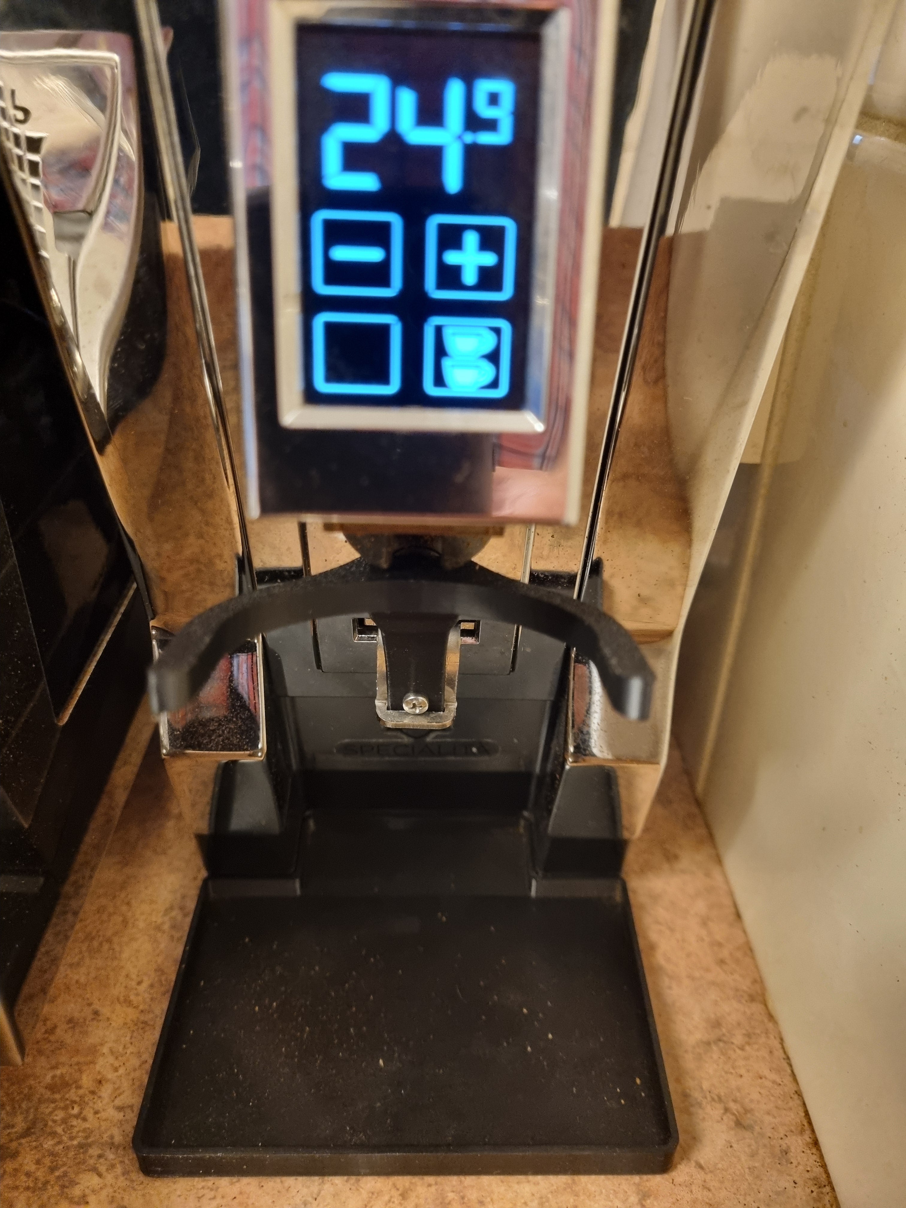 Eine integrierte Abtropfschale minimiert das Verschütten von Kaffeepulver und sorgt für einen sauberen und ordentlichen Arbeitsplatz. Zur einfachen Aktivierung der Mühle können Sie eine Version mit benutzerfreundlicher V2-Taste wählen oder ein selbstklebendes Gummipad verwenden.