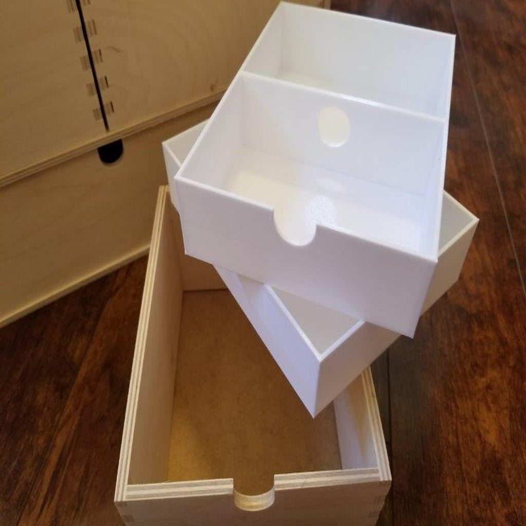Dies sind Einsatzorganisatoren für Ikea MOPPE-Schubladen. Diese passen in die kleineren Schubladen des Moppe-Organizers. Die Unter- und Oberseite sind identisch, mit Ausnahme der Oberseite, die über eine Aussparung für einen Schubladenauszug verfügt.
