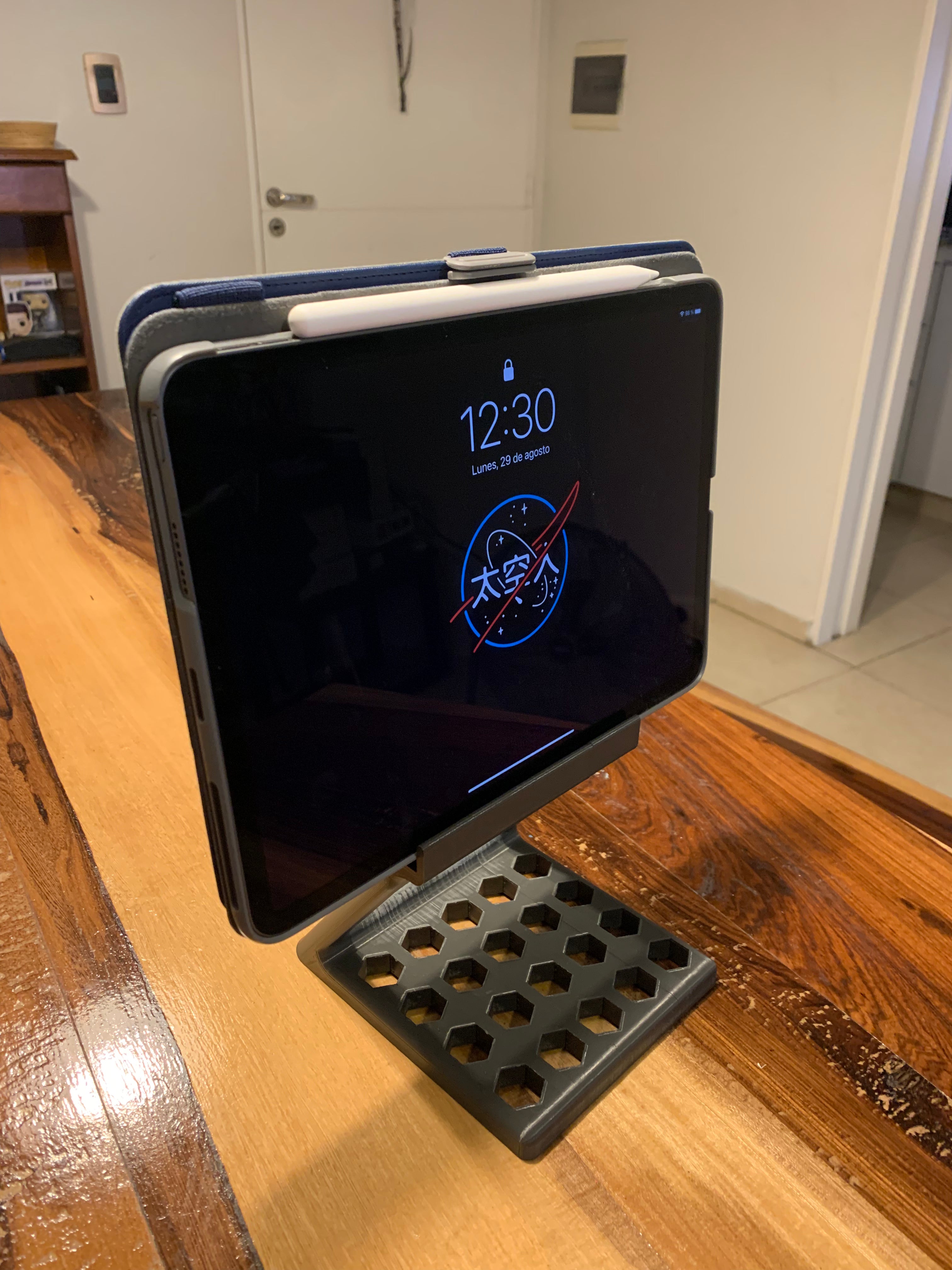 Ein iPad-Halter, der mit Präzision gefertigt wird. Es kann auf den perfekten Blickwinkel zum einfachen Lesen, Surfen oder Videoanrufen eingestellt werden. Sein Design ist schlicht und folgt der minimalistischen Ästhetik des iPad.