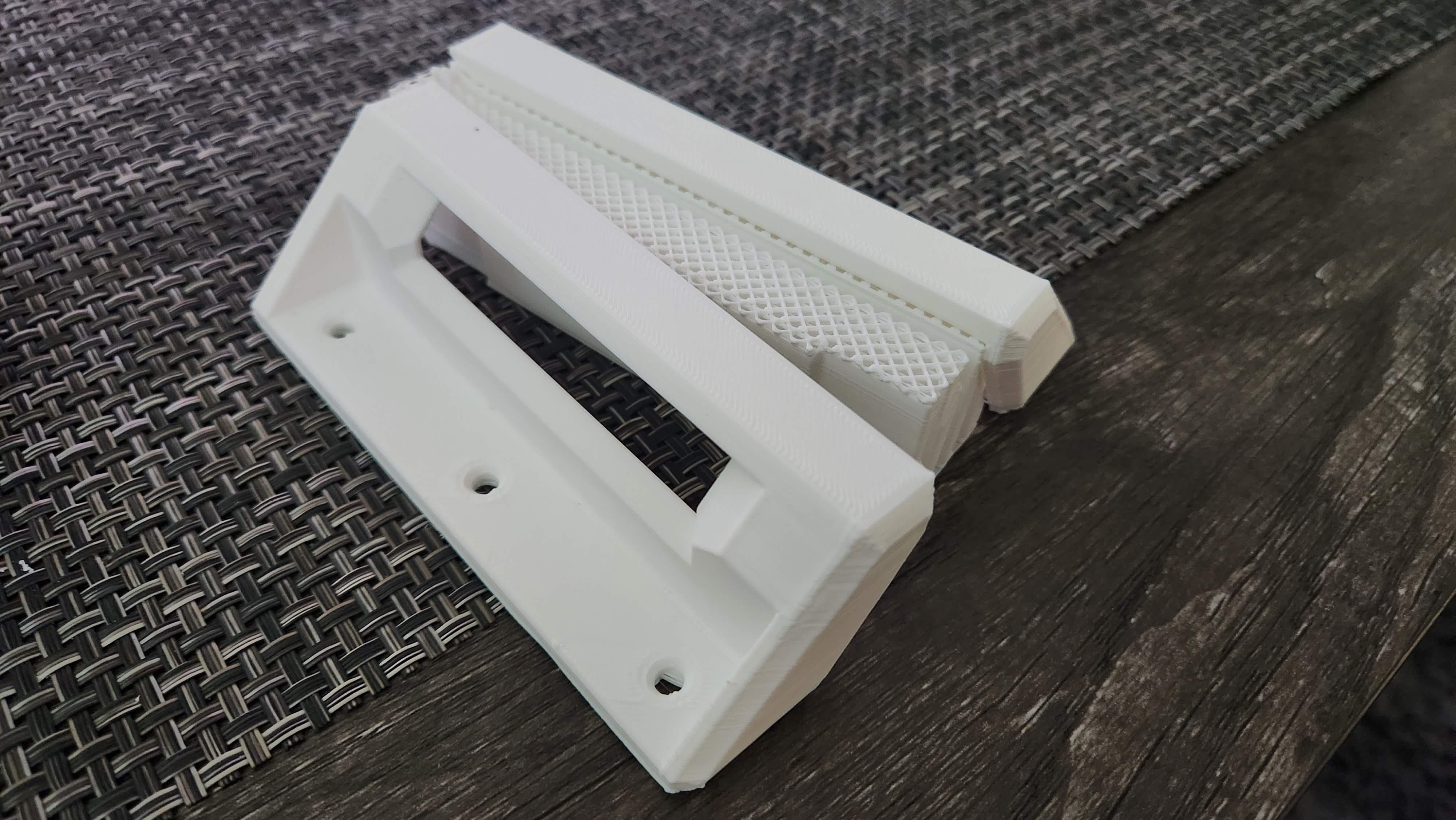 Um die volle Funktionalität zu gewährleisten, ist die Halterung zweiteilig aufgebaut und ermöglicht so ungehinderten Zugriff auf die seitlichen USB-Anschlüsse des Laptops. Die konturierte Form folgt dem seitlichen Profil des Laptops, und integrierte Stützrippen erhöhen die Steifigkeit und Stabilität. Ein integrierter Anschlag verhindert, dass der Laptop versehentlich aus der Halterung rutscht.