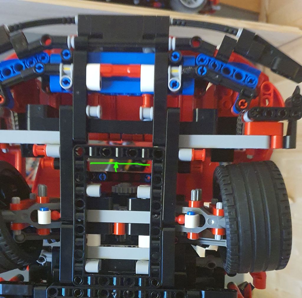 • Fremviser Lego-modellen opretstående med hjulene vendt mod væggen.