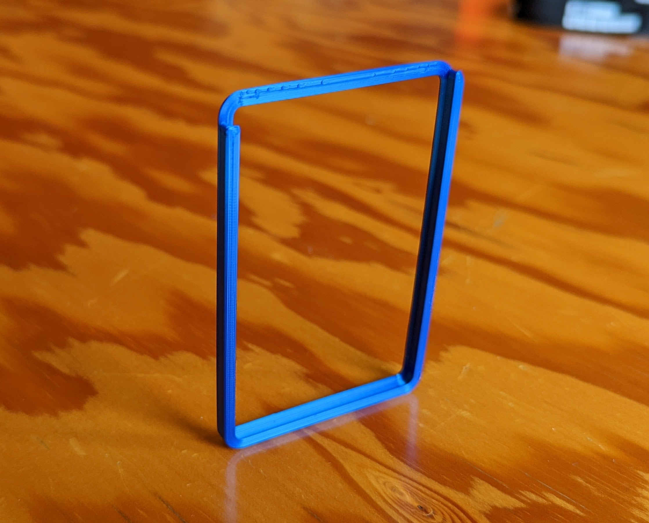 Minimalistisches, offenes Portemonnaie, das in weniger als 20 Minuten gedruckt werden kann und je nach Modell zwischen 3 und 5 Karten aufnehmen kann. Die äußersten Karten werden vollständig angezeigt und alle Karten werden durch einen kleinen Rand oben an ihrem Platz gehalten. Aufgrund der abgeschrägten Oberseite, die auch für einen federnden Druck sorgt, um die Karten an Ort und Stelle zu halten, passen leichte Abweichungen in der Dicke der Karten hinein. Die äußersten Karten können mit einer Hand entnommen werden, indem die Karten leicht gebogen und an der Vorderseite nach oben gedrückt werden.