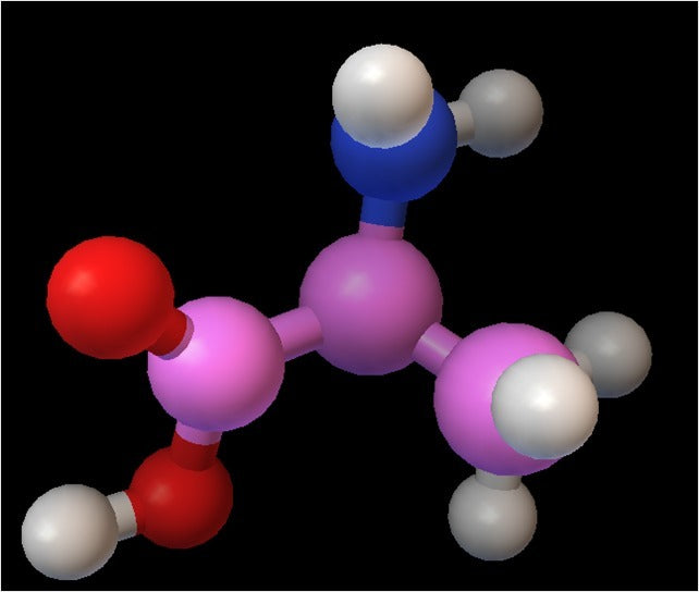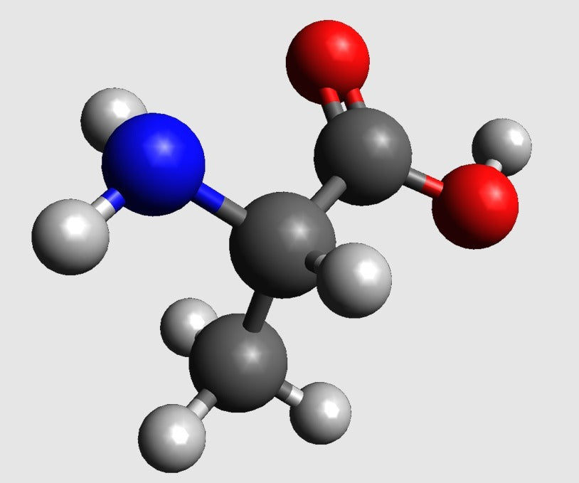 Ein sehr detailliertes 3D-Molekülmodell von Alanin. Alanin ist Bestandteil vieler Proteine ​​und unverzichtbar für das Verständnis des Unterschieds zwischen Glukose und Kohlenhydraten wie Laktose, was verdeutlicht, warum wir unterschiedliche Arten von Nahrungsmitteln benötigen, um den Körper mit den notwendigen Nährstoffen zu versorgen.