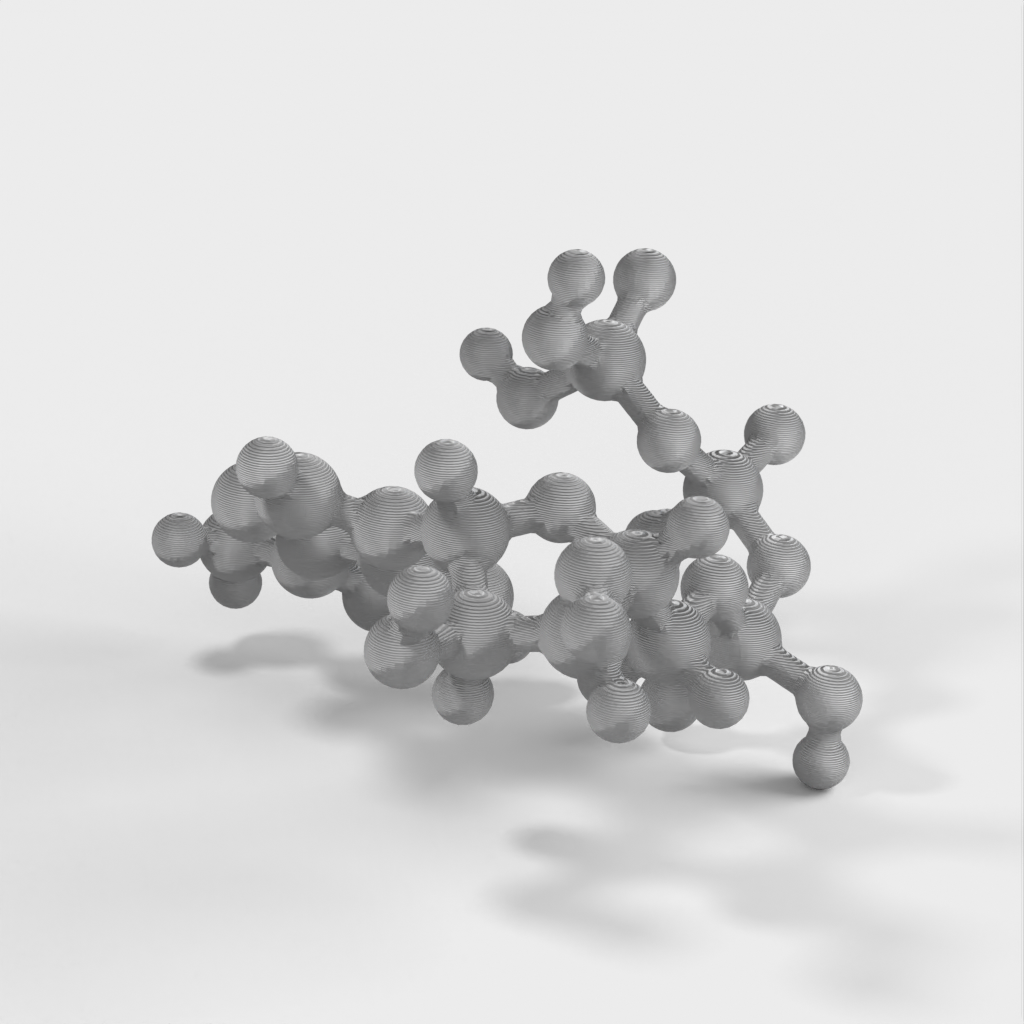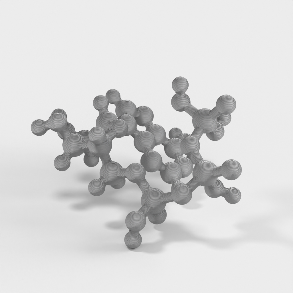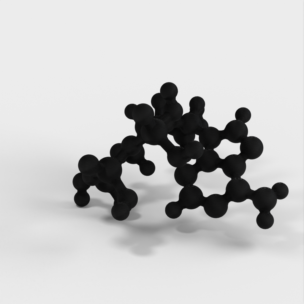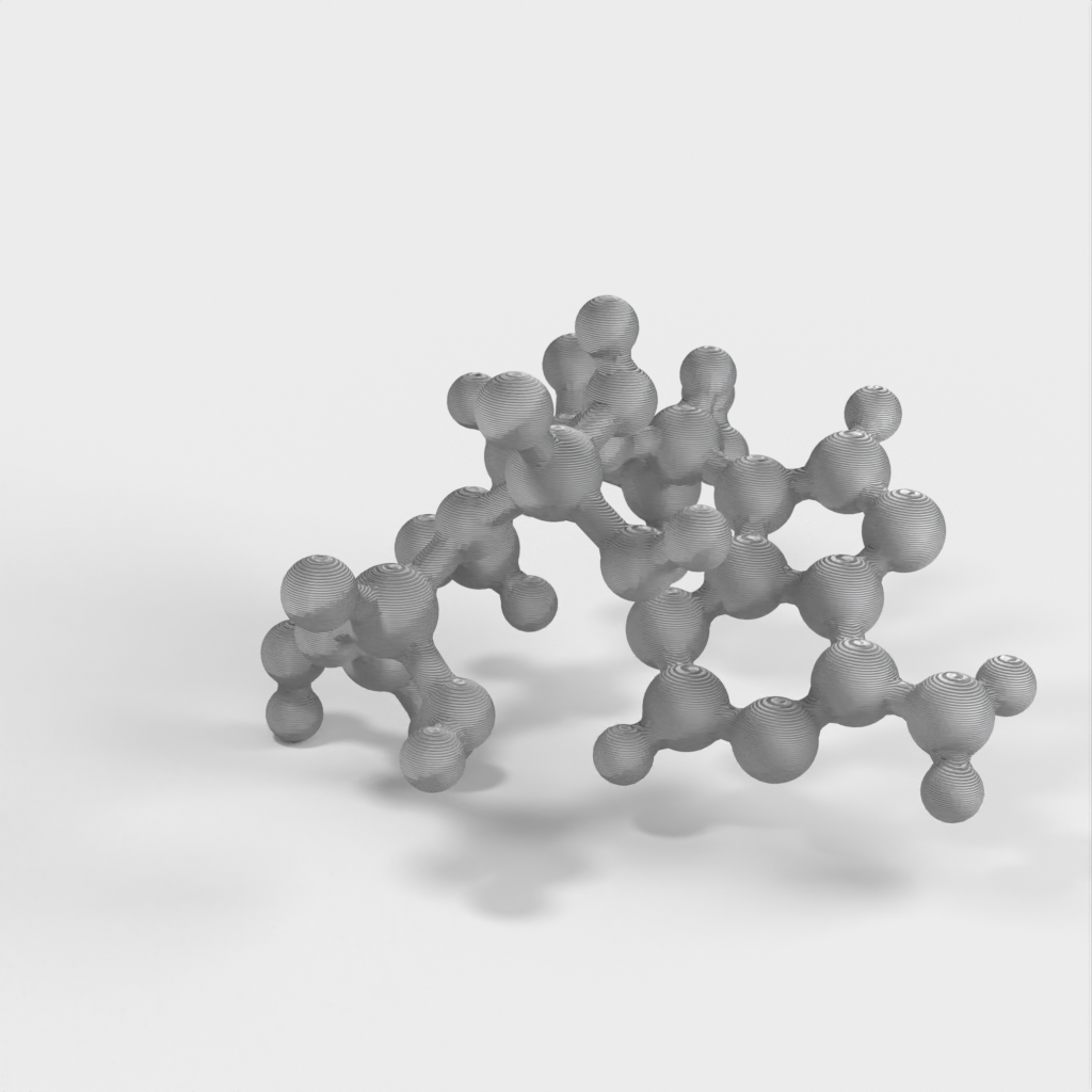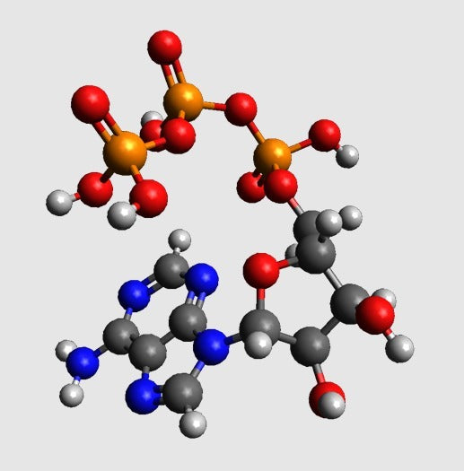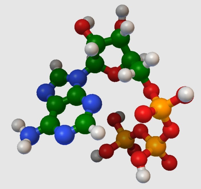Ein molekulares Modell von Adenintriphosphat (ATP). Dieses Modell wird im Chemieunterricht verwendet und eignet sich besonders zur Erklärung des Energieabgabesystems des Körpers. Das Modell kann mit einem ADP-Modell verglichen werden, bei dem es sich um ATP handelt, nachdem es ein Phosphat zur Energiegewinnung bereitgestellt hat. Das Modell ist wasserdicht und für den 3D-Druck geeignet.