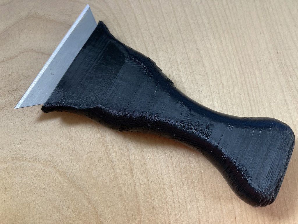 Ein Rasierklingengriff, der robust und effektiv ist, um alte Klebereste vom Glasbett Ihres 3D-Druckers zu entfernen. Es hilft auch, hartnäckige Abdrücke vom Glasbett zu entfernen. Drücken Sie einfach die Klinge in den Griff und sie verriegelt sich. Sowohl scharfe als auch hartnäckige Abdrücke lassen sich leicht entfernen, indem Sie den Griff gegen das Glasbett drücken oder leicht auf das breite Ende des Griffs klopfen, um den Abdruck vom Glasbett zu lösen. Für den Griff gibt es auch eine Variante mit Loch zum Aufhängen.
