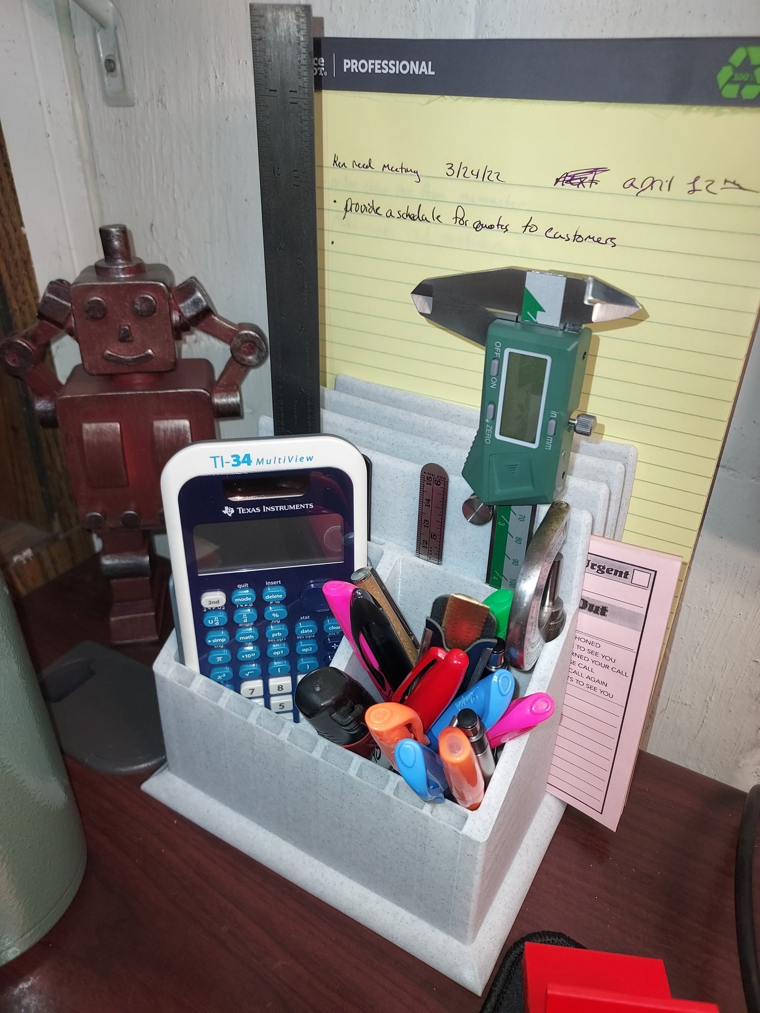 Der Desk Organizer hilft, Ihren Schreibtisch sauber und organisiert zu halten. Es bietet Platz für notwendige Dinge des täglichen Bedarfs wie Papiere, Ordner, Skalierungsinstrumente und andere Kleinigkeiten. Es bietet Platz für eine Mikrometerschraube und einen Messschieber für einfache Messungen und Präzisionsarbeiten. Dieses Zubehör sorgt für Ordnung und Ordnung auf Ihrem Schreibtisch und stellt gleichzeitig sicher, dass Ihre wichtigsten Gegenstände immer griffbereit sind.
