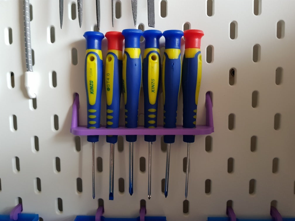 Schraubenhalter für IKEA Skadis (SKÅDIS) Wandboard, konzipiert für die Aufnahme von 6 kleineren Schraubendrehern. Der Halter passt perfekt in das Organisationssystem Ihres Skadi und sorgt dafür, dass Ihre Schraubendreher einfach an Ort und Stelle und griffbereit bleiben. Dieser Halter eignet sich gut für die Aufnahme von Schraubendrehern mit Griffen, die kleiner als das Metallteil sind, und verfügt über eine vollständige Aussparung zum Einschieben. Er ist mit 7 Steckplätzen ausgestattet, kann aber nur 6 Schraubendreher gleichzeitig aufnehmen.