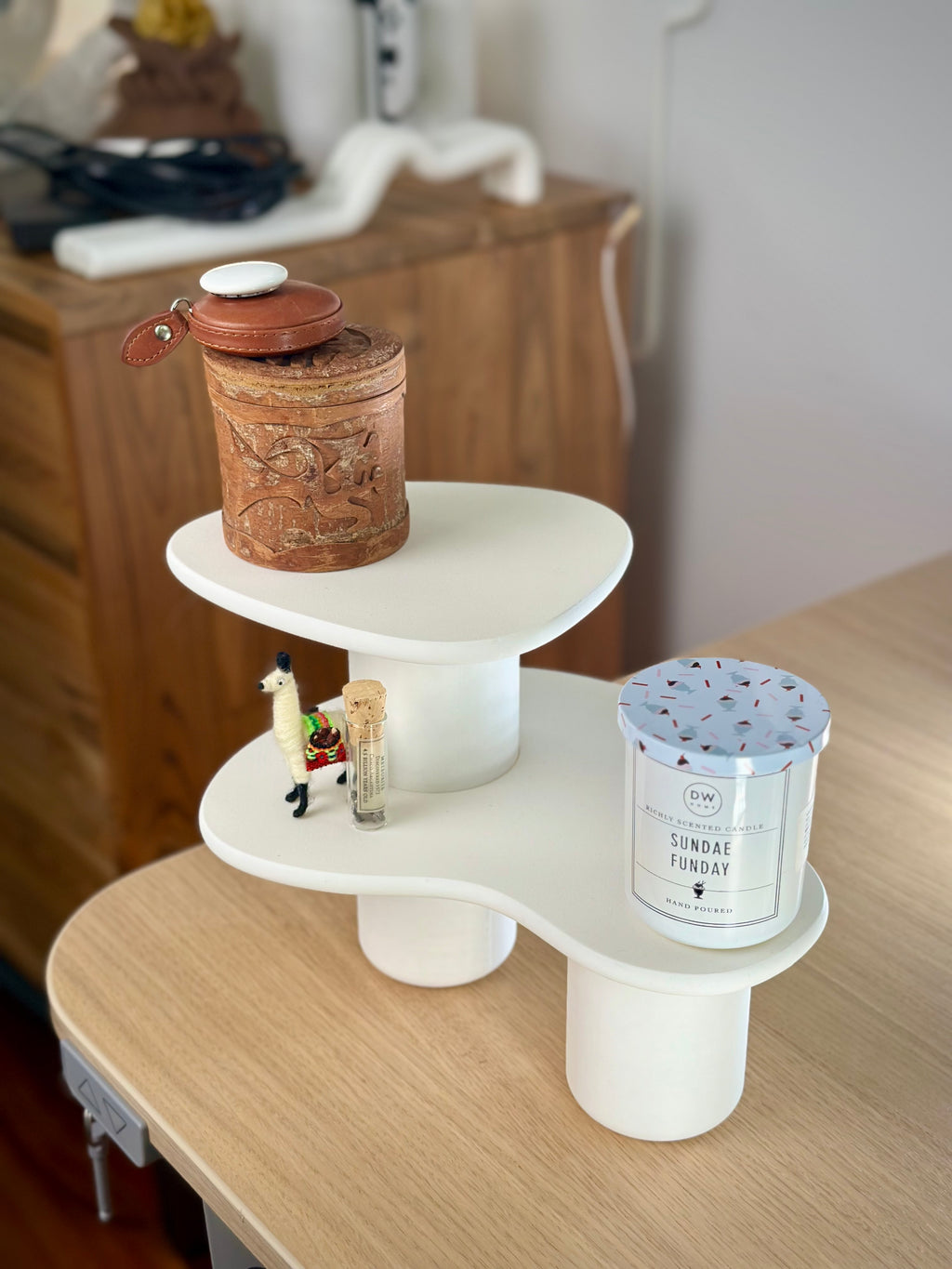 Der Wavy Stand bietet Platz für dekorative Gegenstände und praktische Werkzeuge und ist die ideale Lösung für alle, die ihren Raum effizient organisieren möchten. Die drehbare zweite Ebene ermöglicht eine individuelle Gestaltung und ermöglicht Ihnen die Gestaltung Ihrer persönlichen und dynamischen Präsentation.