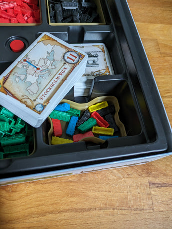 Mit dieser Ordnungslösung wird der Platz in der Spielbox optimal ausgenutzt und Ihre Spielkomponenten bleiben ordentlich gesammelt und geordnet . Es handelt sich um eine funktionale Box , die Ihnen hilft, Ihr Ticket To Ride -Spiel ordentlich und einsatzbereit zu halten, sodass Sie sich voll und ganz auf das Streckennetz und die Strategie konzentrieren können.