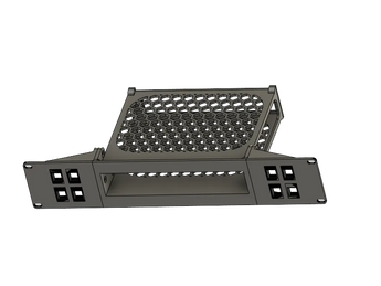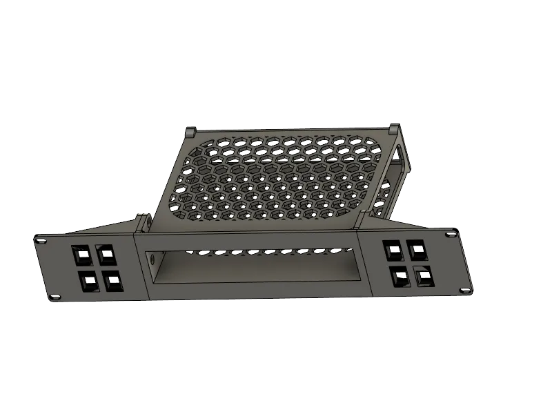 Dette 2U rackbeslag gør det muligt at montere en Ubiquiti UniFi US-8-150W switch i et standard 19-tommer rackskab. Designet inkluderer valgfrie sidepaneler med plads til keystones, hvilket sikrer en pæn og organiseret netværksinstallation. Monteringen kræver M5-skruer og møtrikker for sikker fastgørelse.