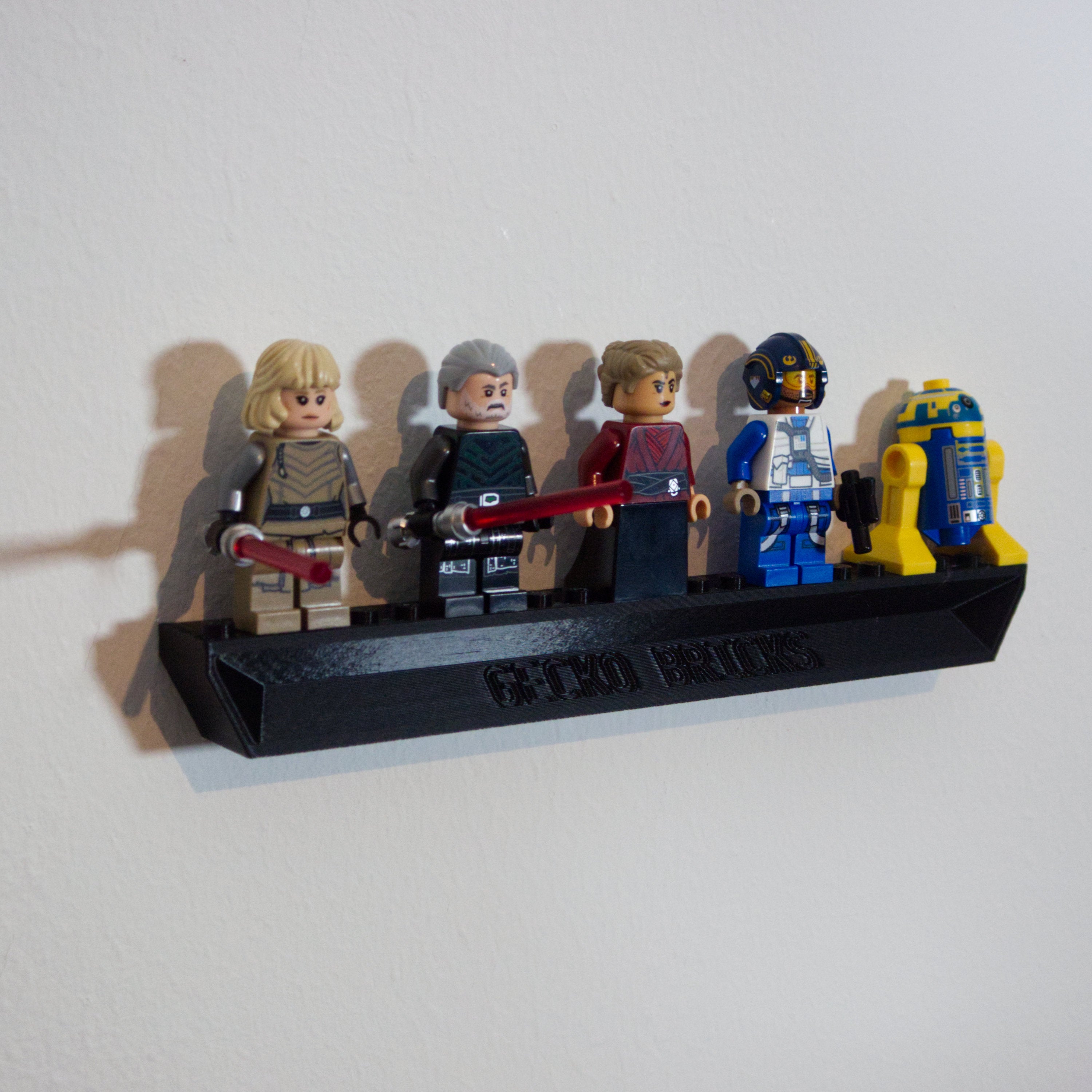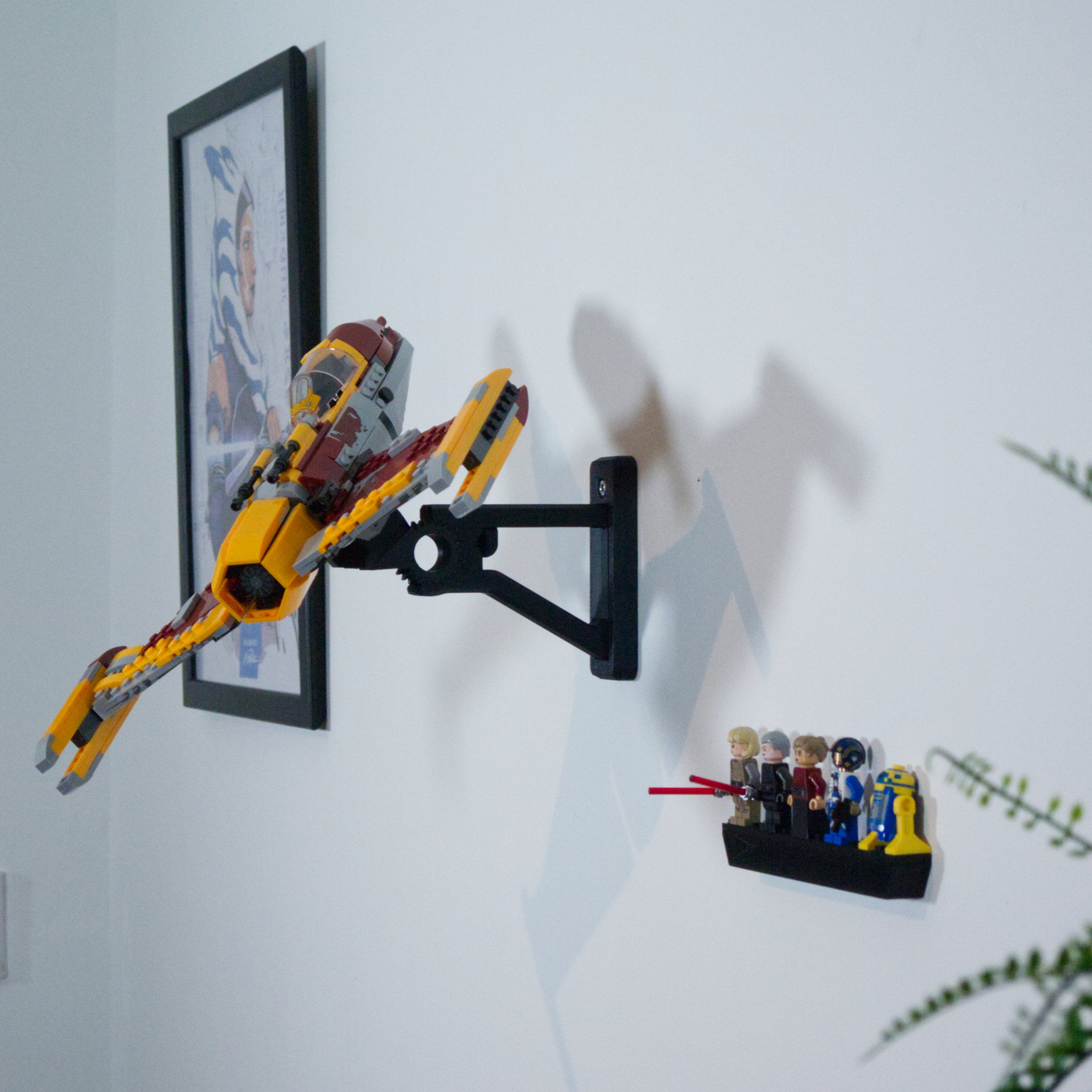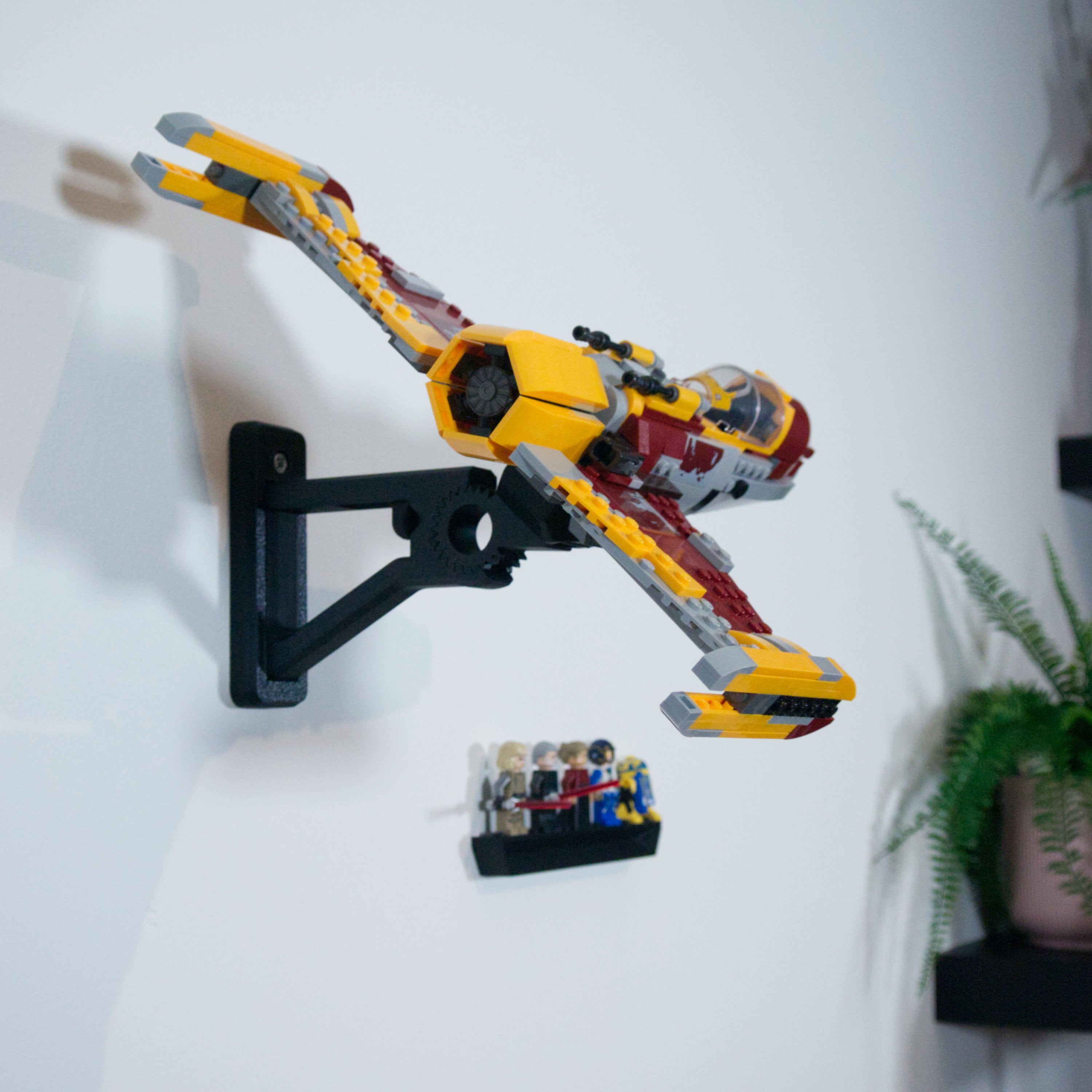 Dette justerbare vægbeslag giver mulighed for at udstille Shin Hati's Starfighter i forskellige vinkler og positioner. Designet gør det nemt at tage modellen ned efter behov, og løsningen inkluderer en separat holder til minifigurer, så hele sættet kan præsenteres samlet på væggen.