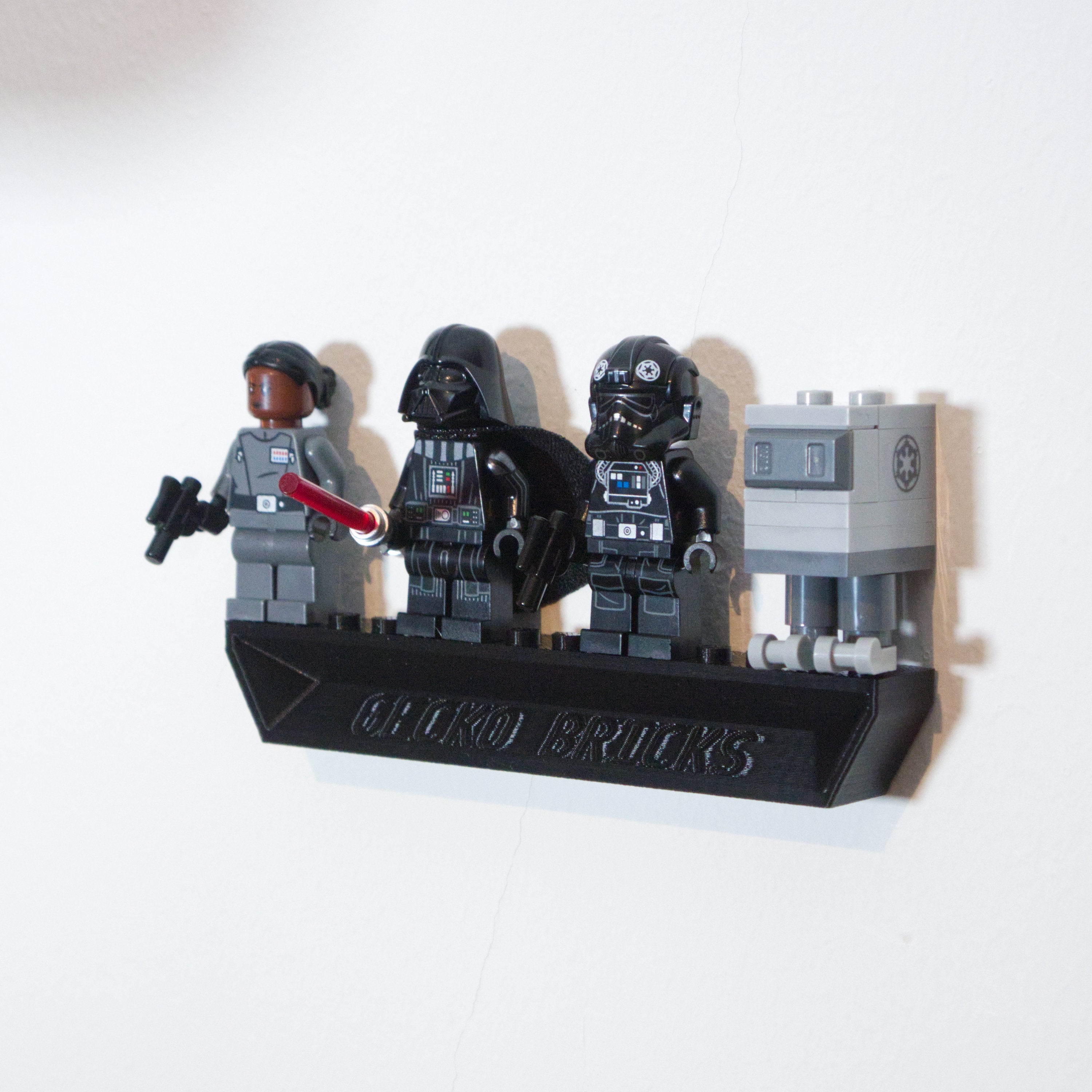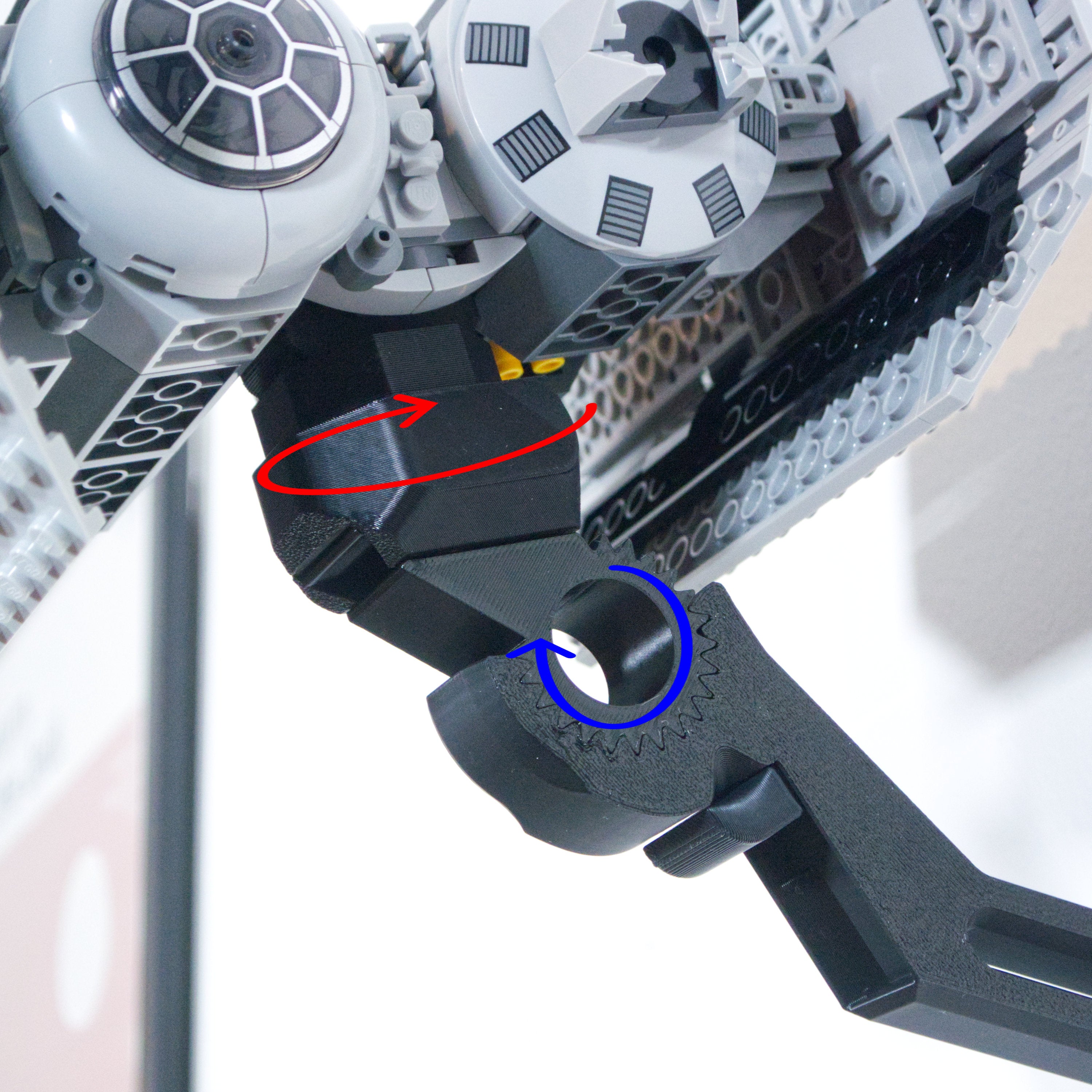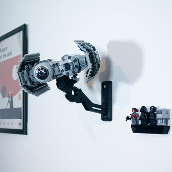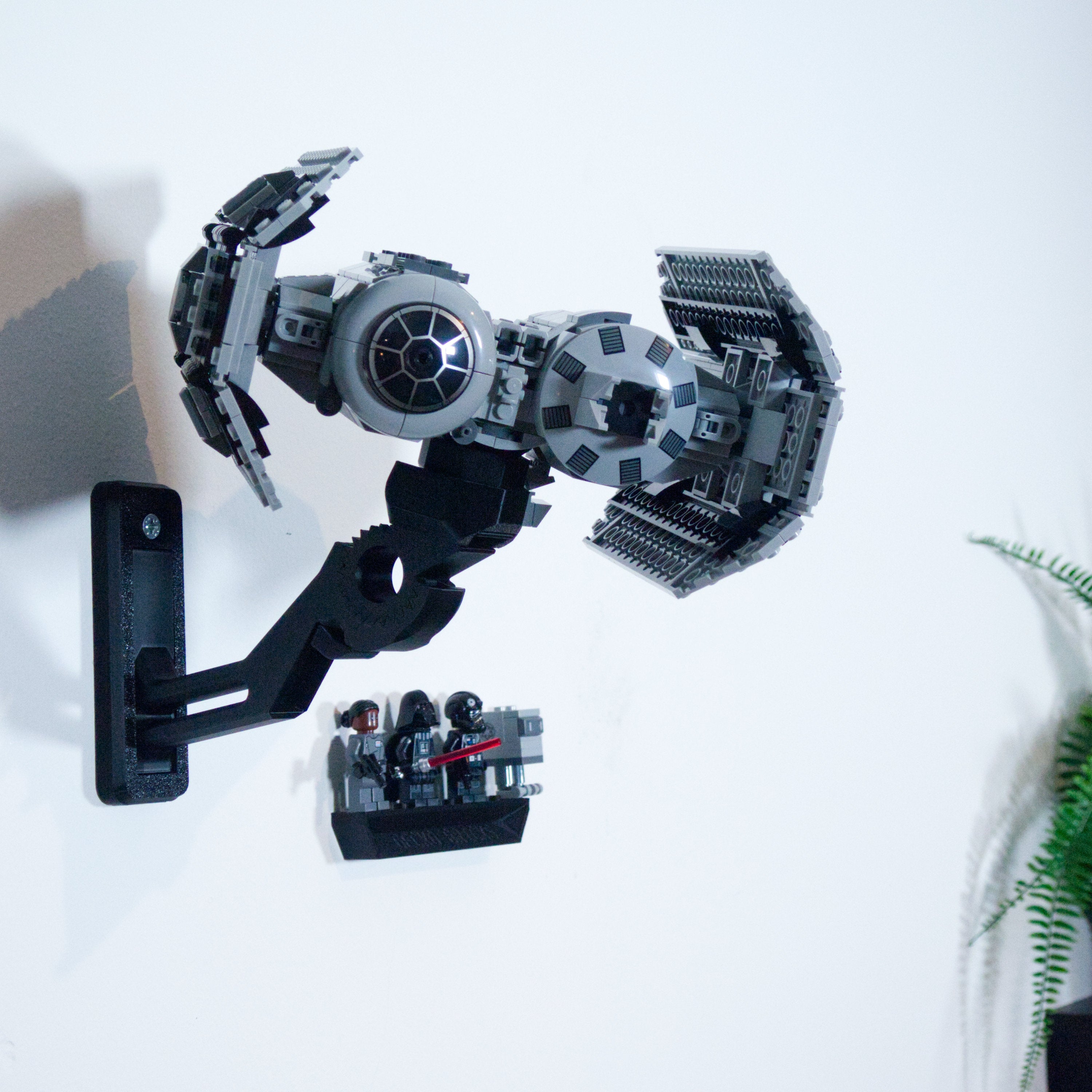 Dette vægbeslag til Star Wars Imperial TIE Bomber lader dig udstille modellen i fem forskellige vinkler på væggen. Konstruktionen gør det muligt at rotere skibet mod højre og venstre eller hænge det lige frem. Der medfølger en separat holder til minifigurer for en komplet præsentation.