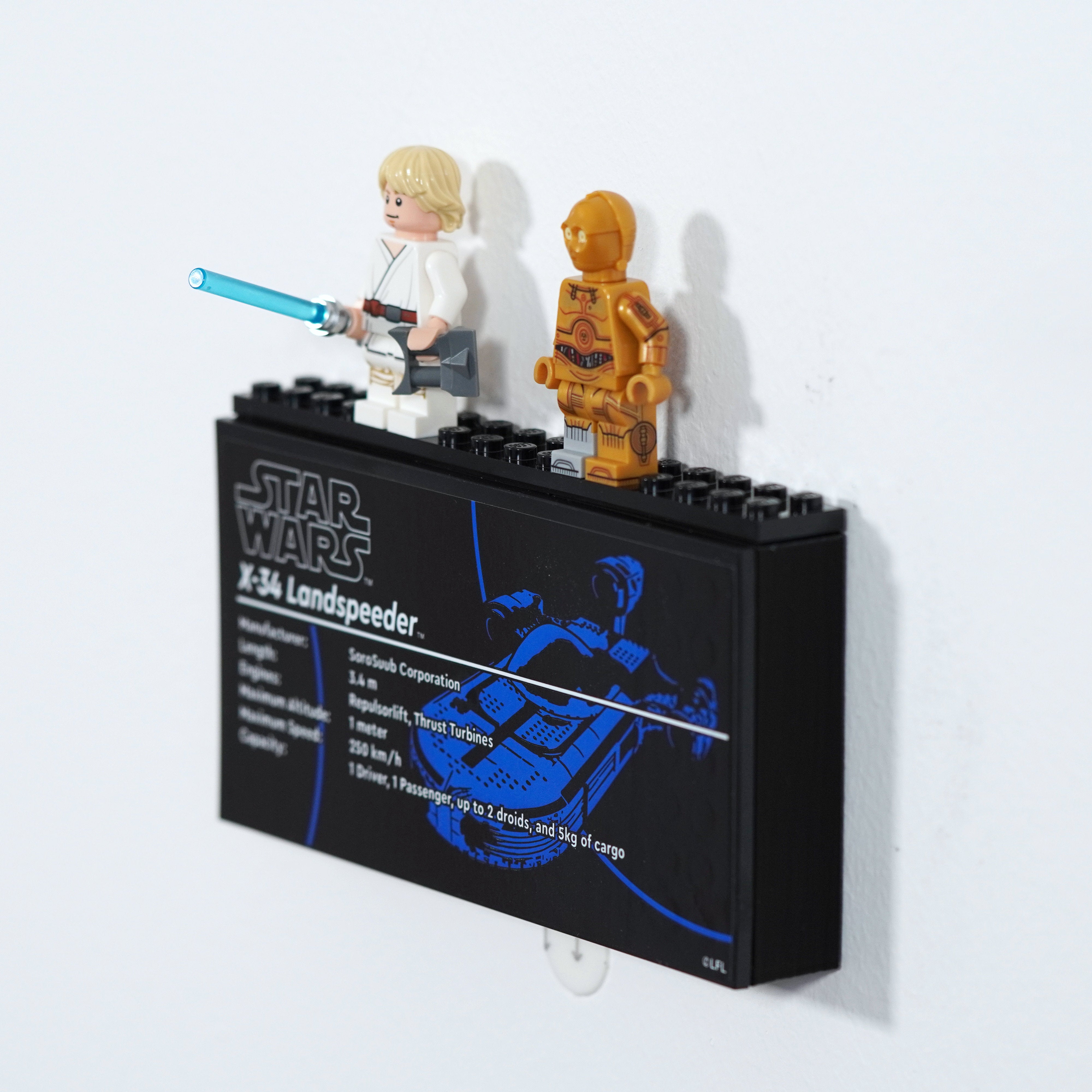 Dette vægbeslag er designet specifikt til Luke Skywalkers Landspeeder sæt 75341. Det giver mulighed for at præsentere modellen vendt mod enten venstre eller højre. Løsningen inkluderer holder til informationspladen og plads til minifigurerne, og montering kræver blot to almindelige vægskruer.
