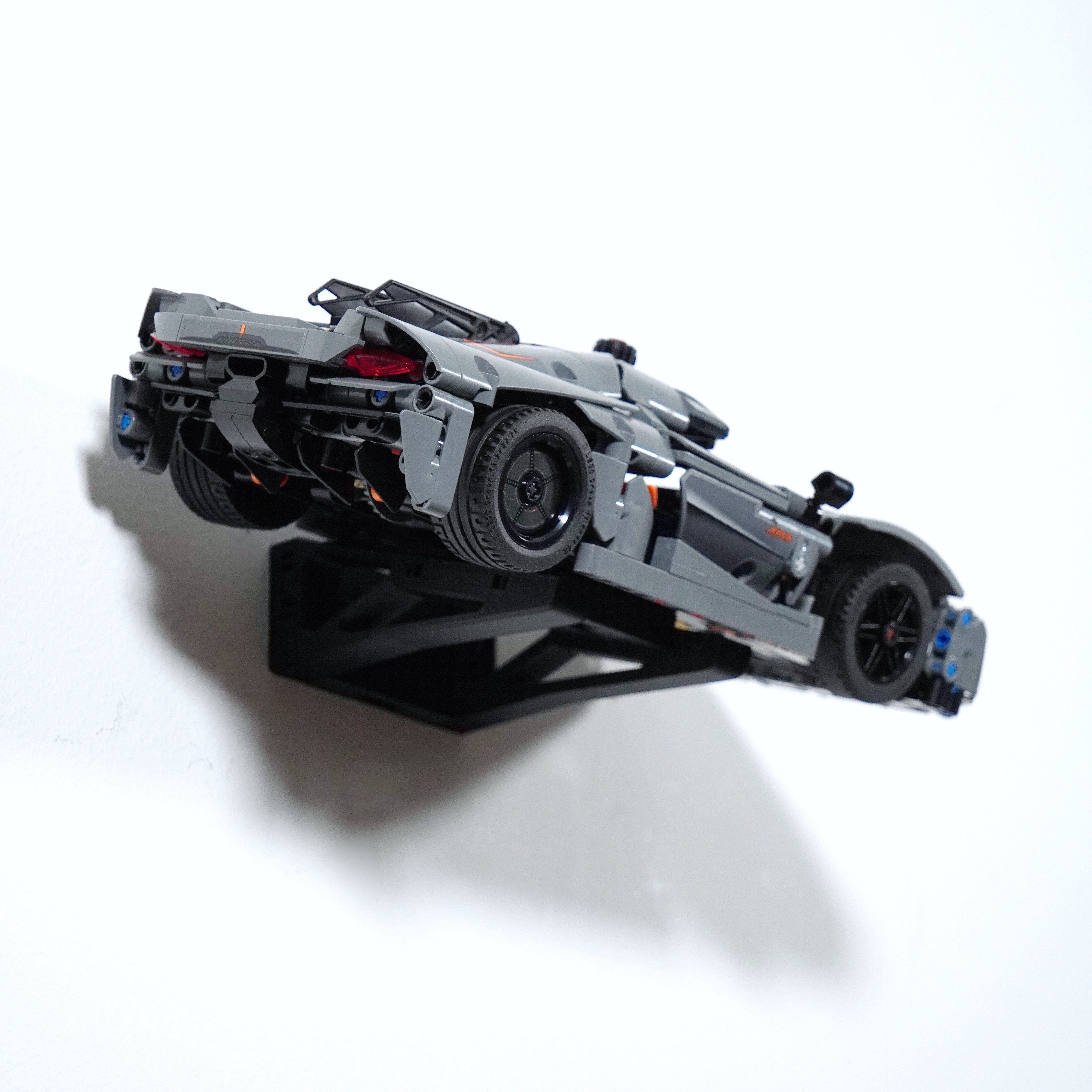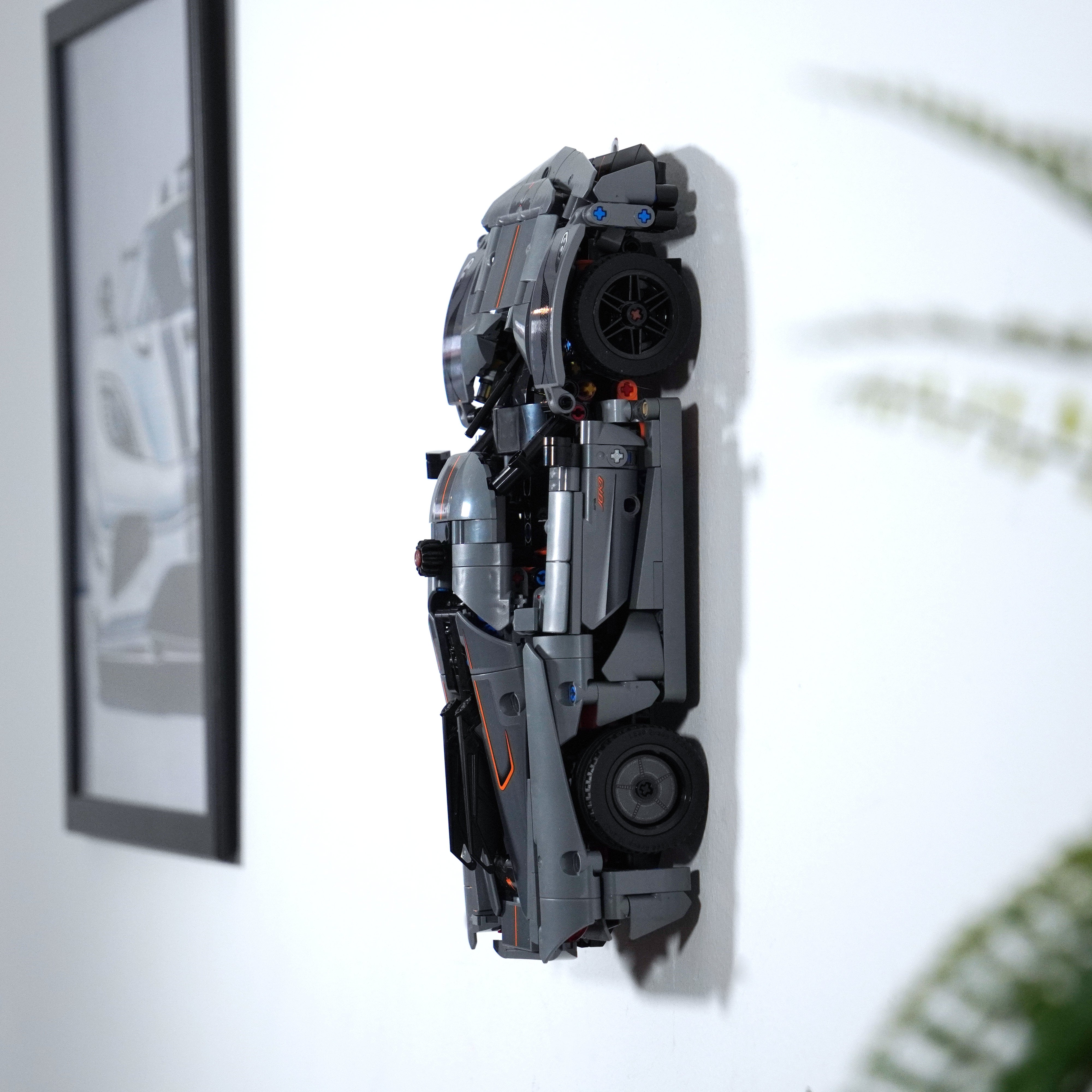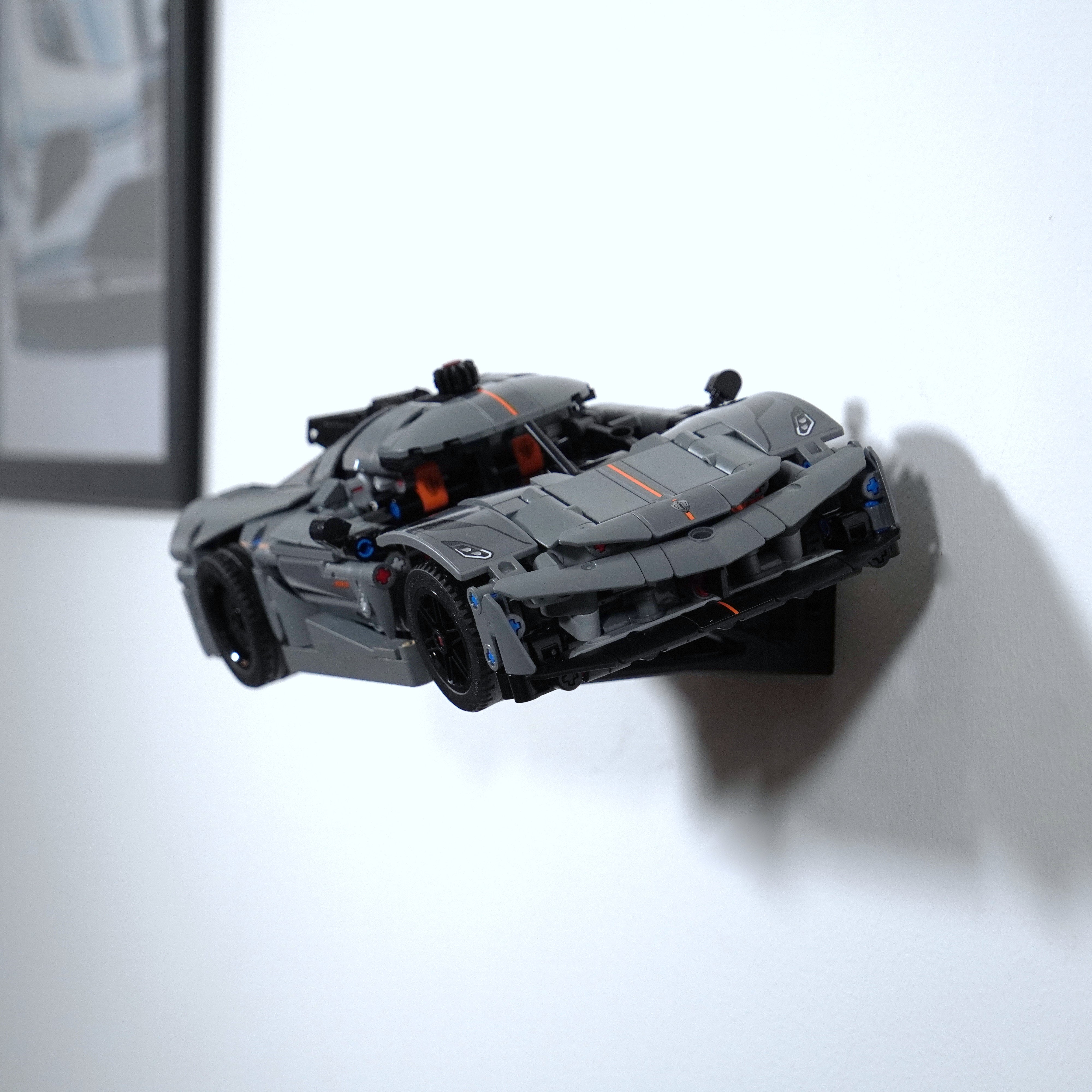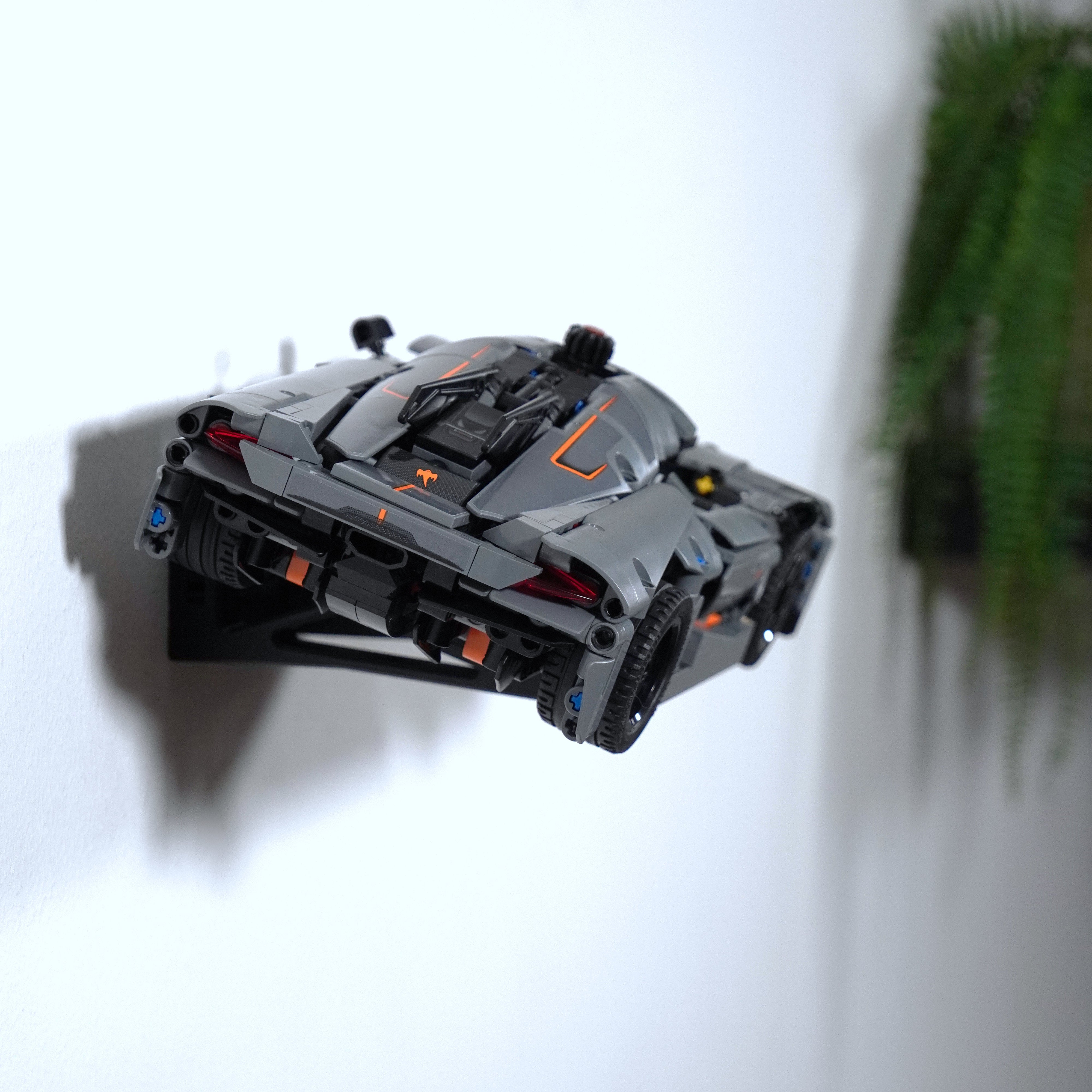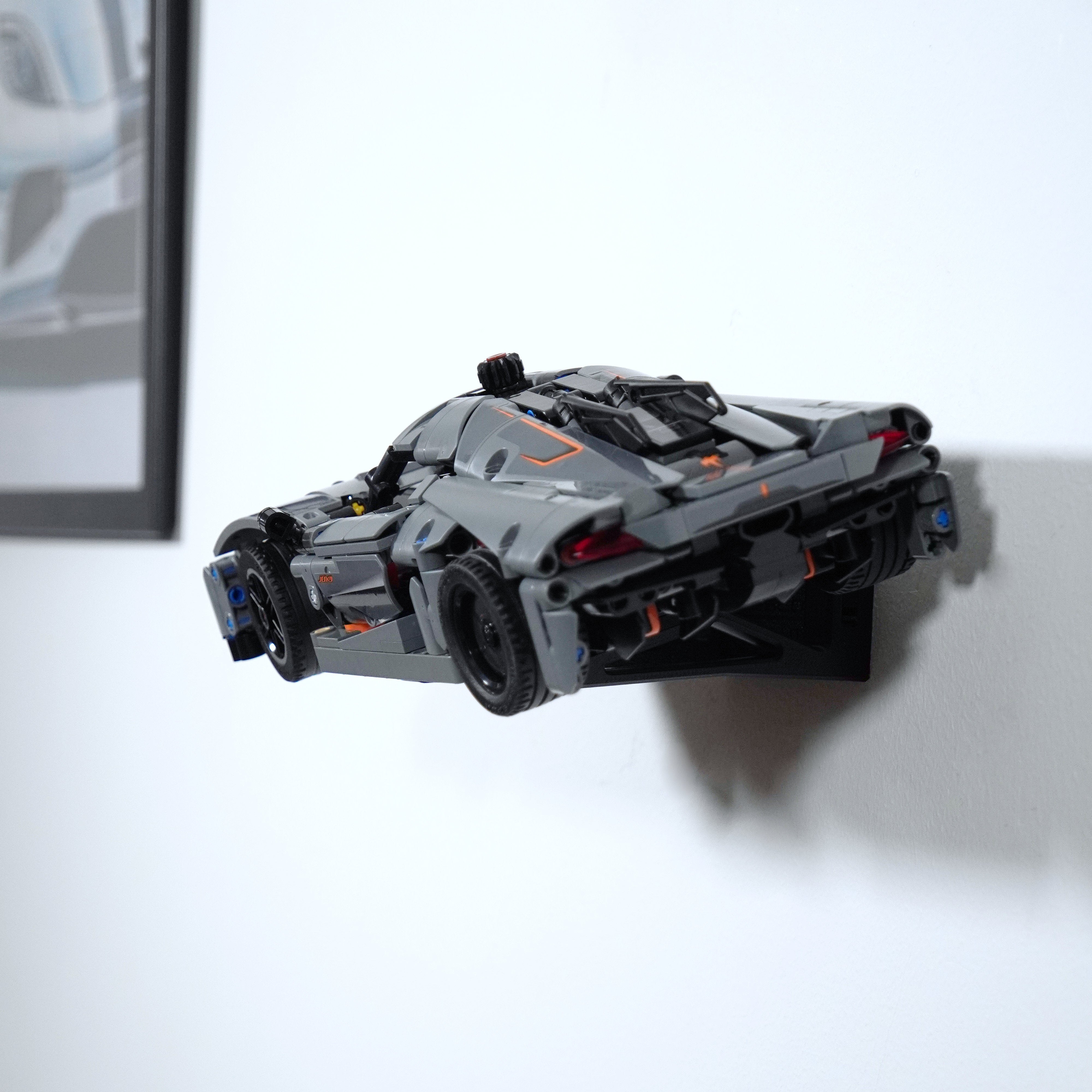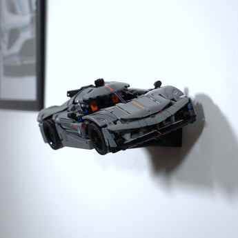 Dette vægbeslag er specielt designet til Technic Koenigsegg Jesko modellerne, både den grå og hvide udgave. Beslaget giver mulighed for at udstille bilen horisontalt vendt mod enten højre eller venstre, samt vertikalt fladt mod væggen. Konstruktionen sikrer nem montering med kun ét skruehul og let aftagning af bilen.