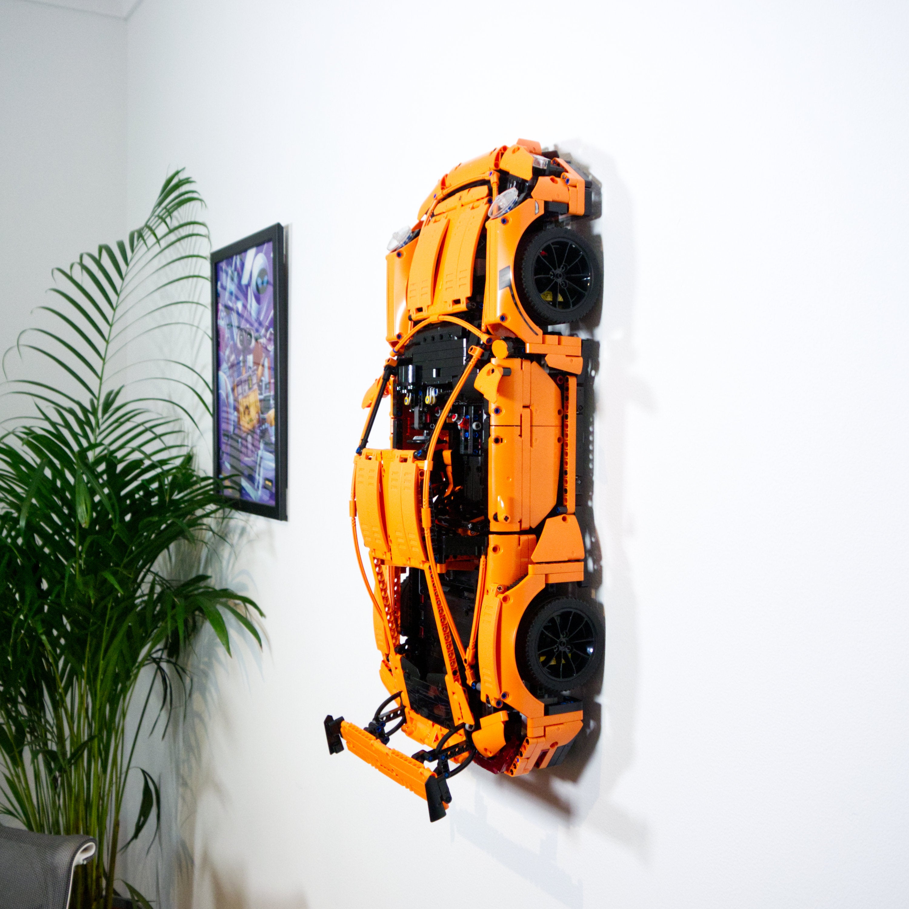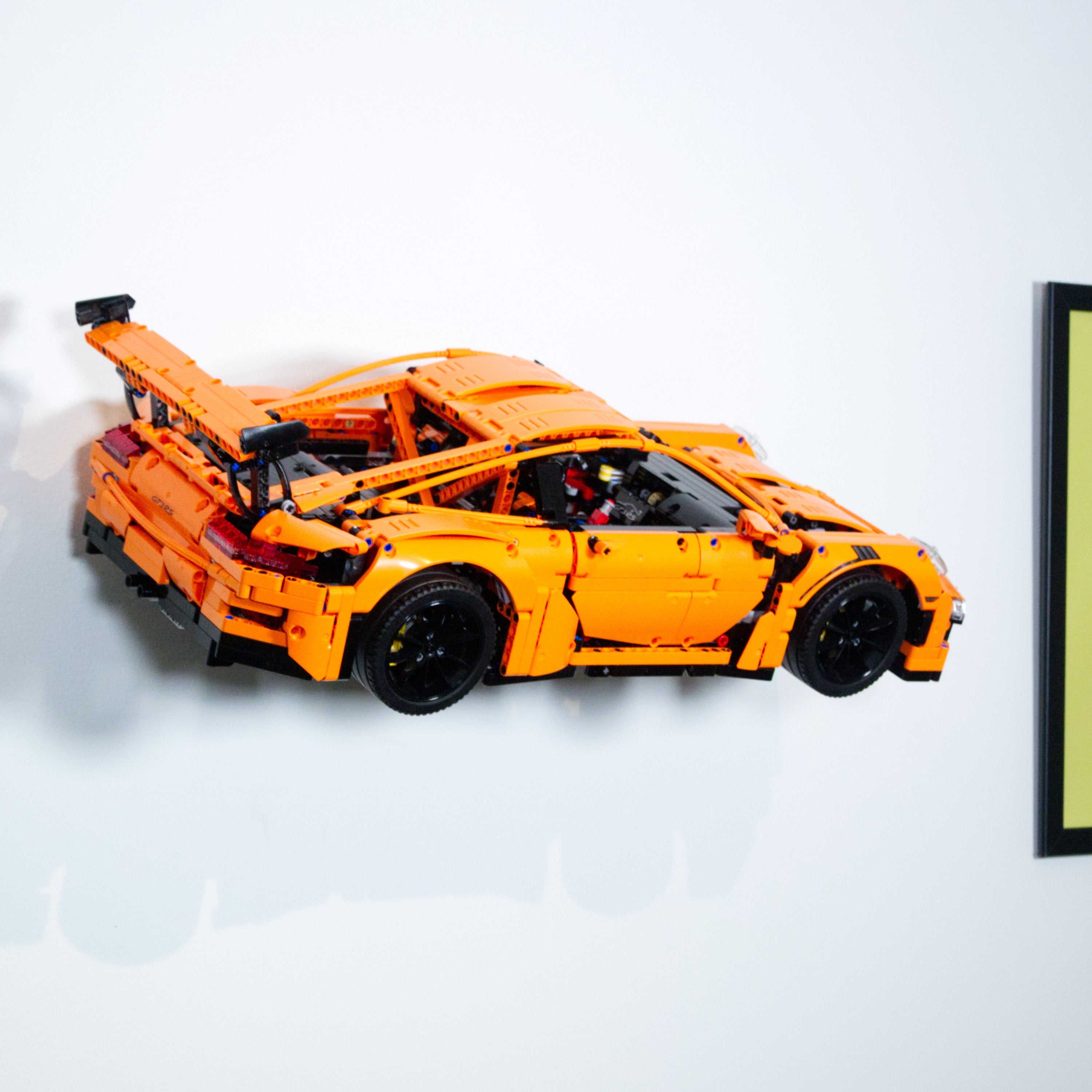 Dette vægbeslag er designet til Technic Porsche 911 GT3 RS 42056 og gør det muligt at præsentere modellen på væggen. Beslaget tilbyder fleksible visningsmuligheder, hvor bilen kan monteres enten vinklet ud fra væggen mod højre eller venstre, eller placeres fladt vertikalt for et diskret udtryk.