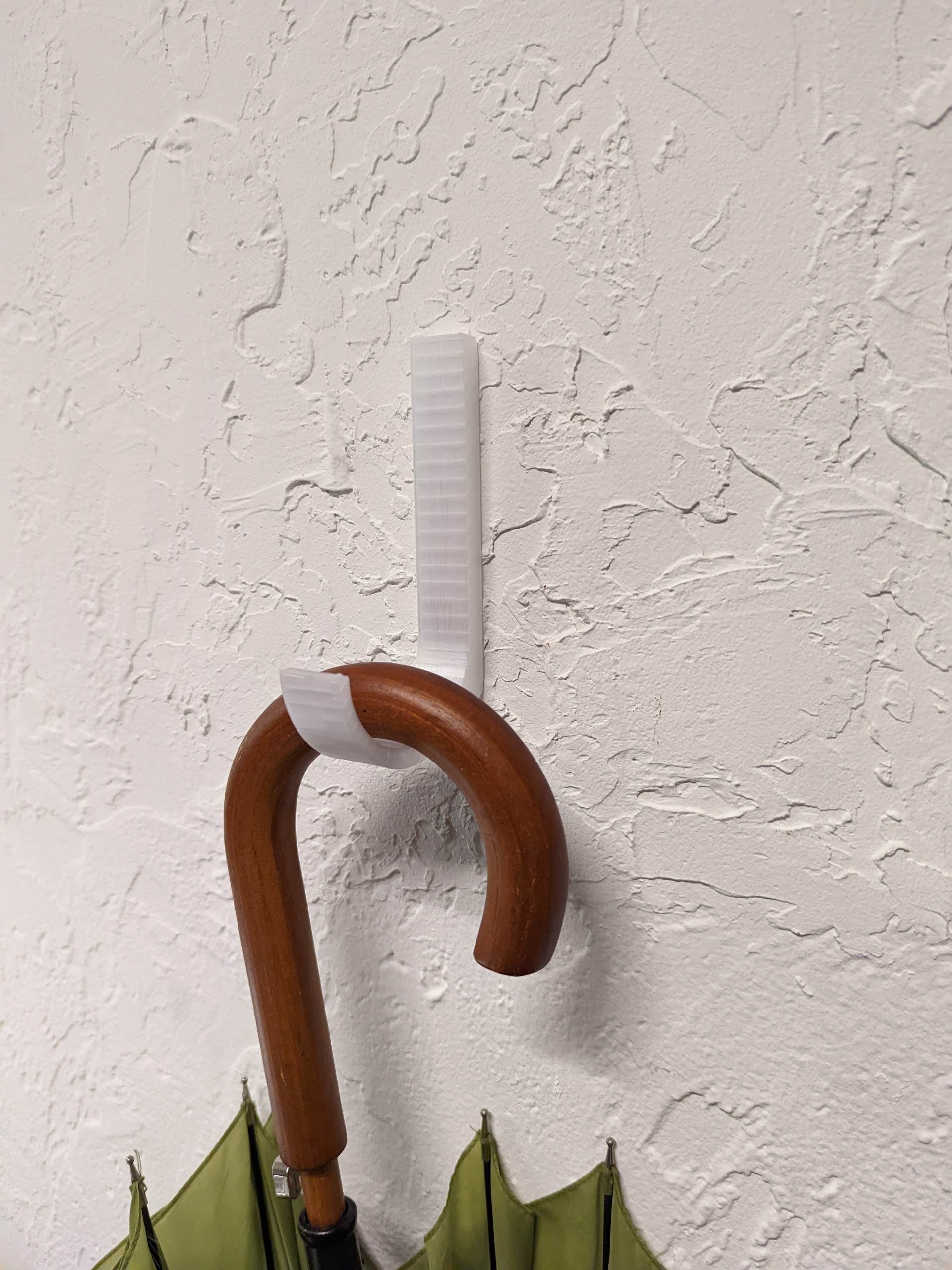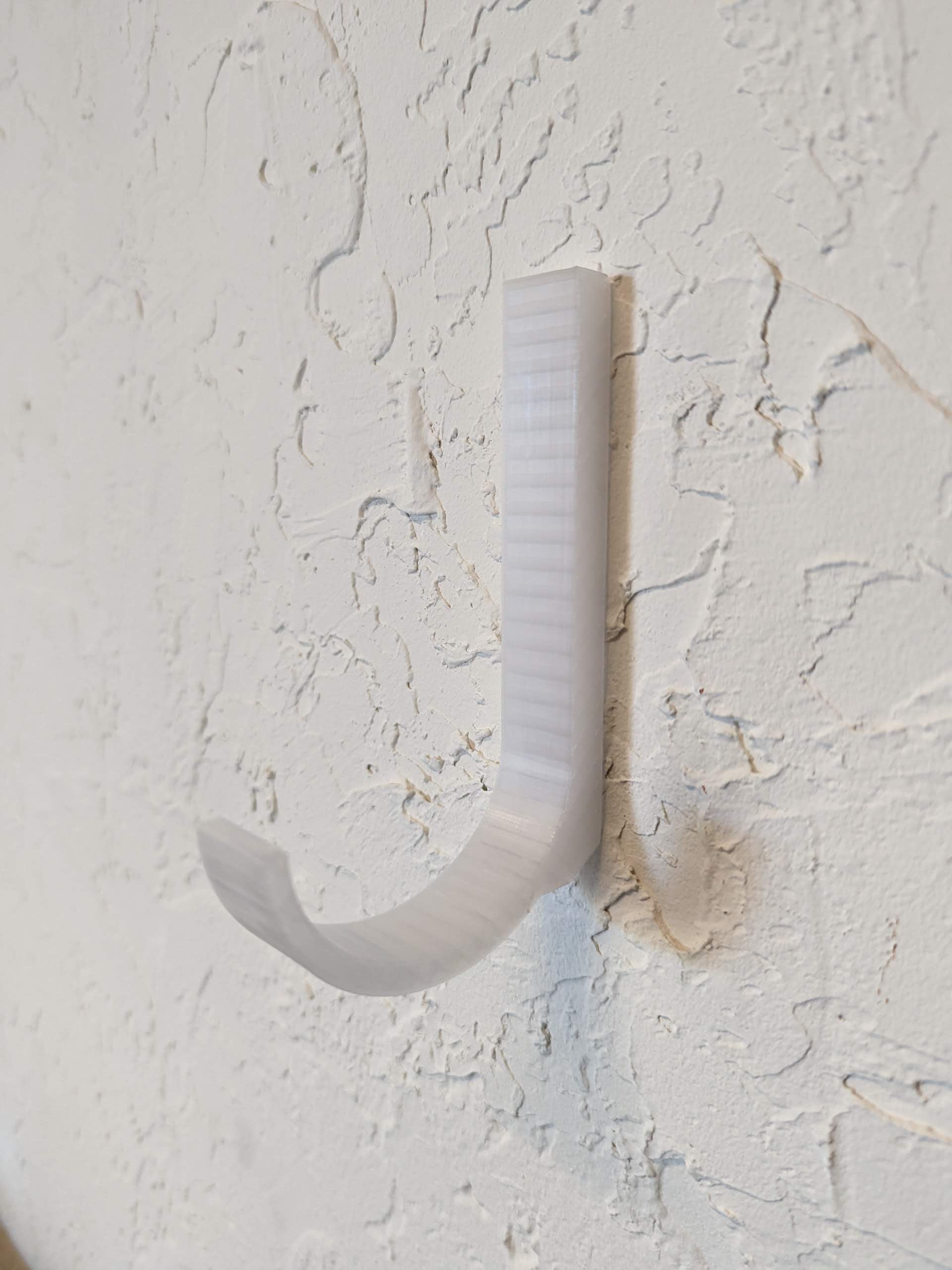 Wandhaken zum Aufhängen von Gegenständen wie einem Regenschirm. Dieser Wandhaken ist aus PETG bedruckt und für die Befestigung mit den internen Schraubenlöchern vorbereitet.