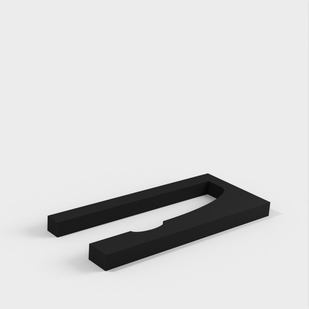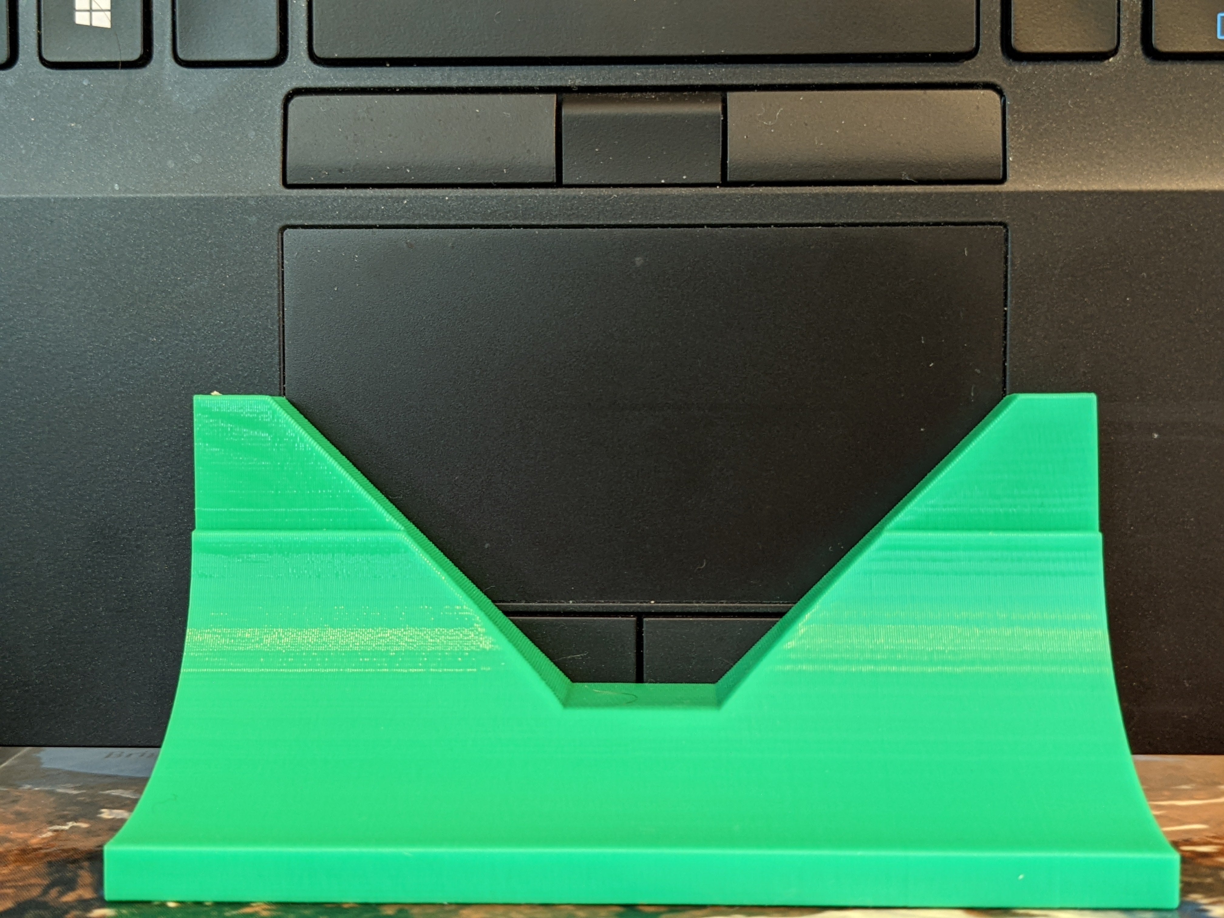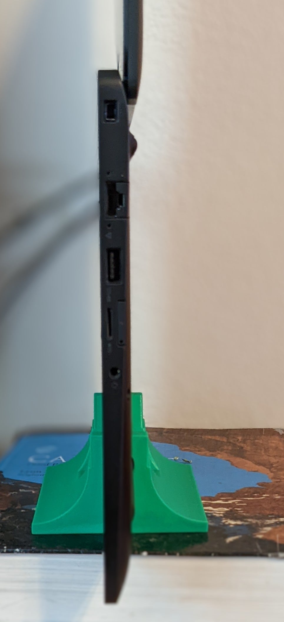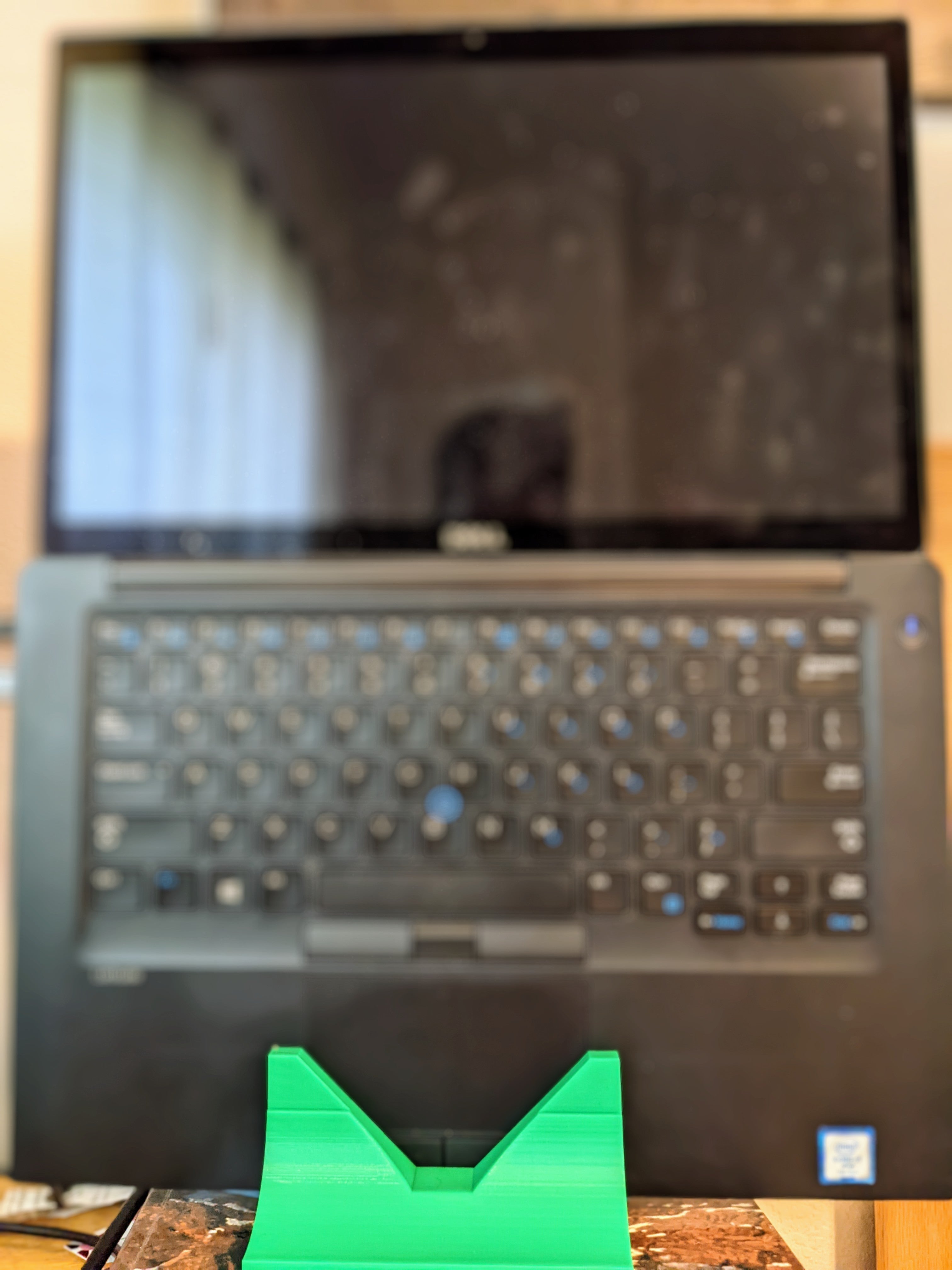 Dies ist ein Laptopständer, um den Laptop Dell Latitude 7480 (~2018) vertikal zu halten, wobei der Bildschirm um 180 Grad geöffnet ist. Der Anschlag wird von unten aufgesetzt oder seitlich aufgeschoben. Diese Platzierung des Bildschirms ermöglicht ein ergonomischeres Arbeiten bei Verwendung einer externen Tastatur und Maus. Beachten Sie, dass es einen Kanal für das Gummiband gibt. Es sollte perfekt passen: schön eng anliegend, ohne zu eng zu sein. Um es zu entfernen, schieben Sie es nach beiden Seiten.