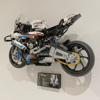 Dette vægbeslag gør det muligt at fremvise din BMW M 1000RR 42130 elegant på væggen. Det kobles sikkert til modellen via de originale technic-stifter og kræver kun én skrue til montering. Der medfølger desuden en separat holder til informationspladen for en komplet præsentation.