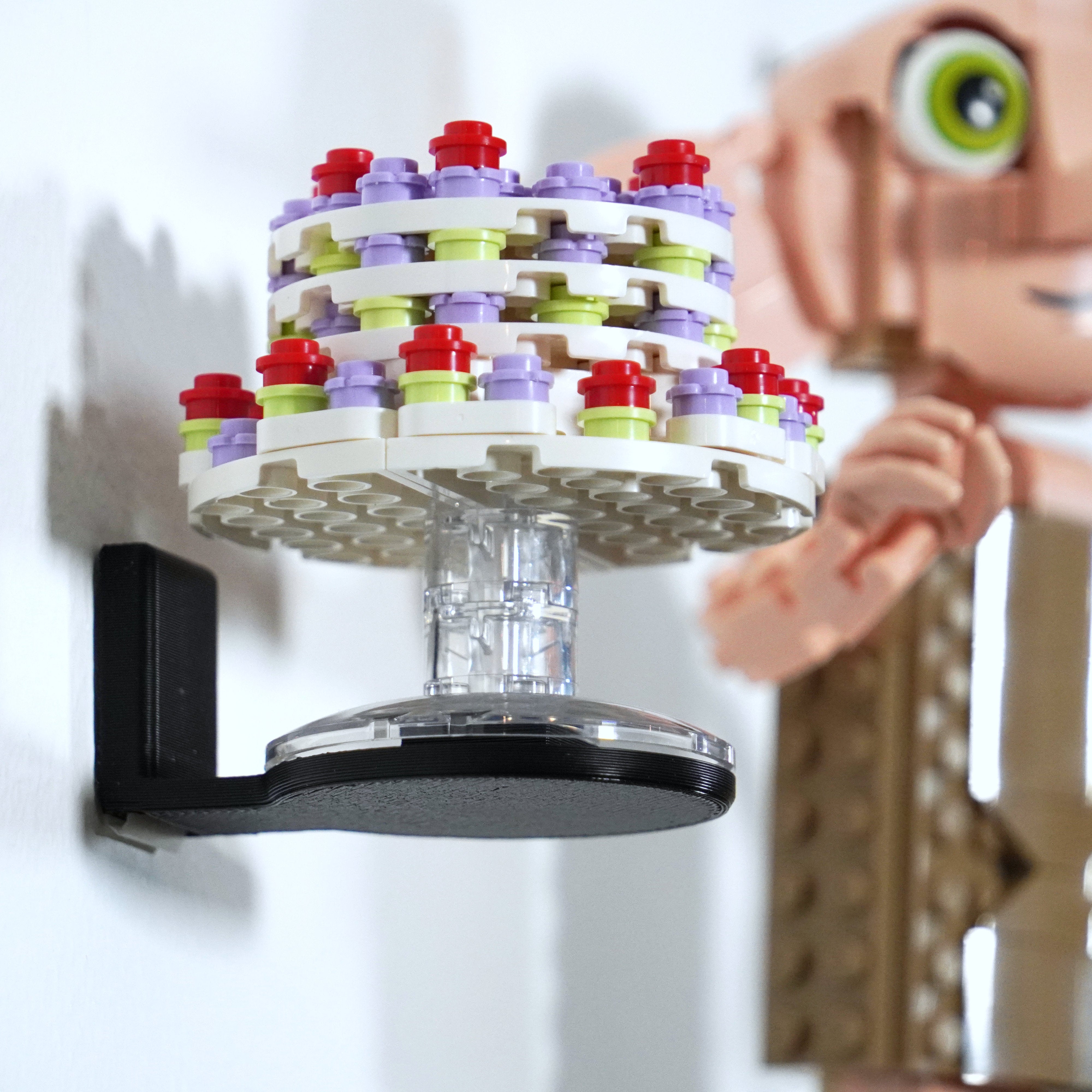 Diese Wandhalterung bietet eine stabile Präsentation für das Harry Potter Dobby Hauselfen-Set 76421. Die Lösung ermöglicht es, das Modell bei Bedarf einfach wieder abzunehmen. Ein Befestigungspunkt für das Kuchenzubehör ist enthalten, und die Halterung wird mit zwei Schrauben sicher an der Wand befestigt, um eine ansprechende Präsentation zu gewährleisten.